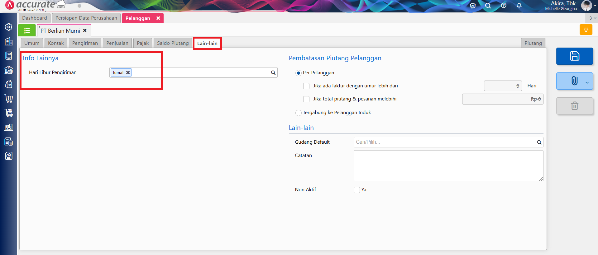 - Isikan informasi terkait atribut tambahan tersebut pada data pelanggan yang bersangkutan melalui menu Penjualan | Pelanggan, lalu ke tab Lain-lain.