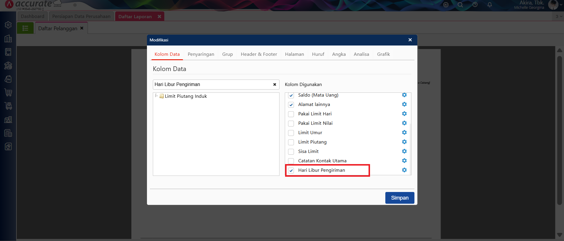 - Untuk menampilkan informasi atribut tambahan pada Laporan, maka perlu melakukan modifikasi pada laporan tersebut. Misalnya pada Laporan Daftar Pelanggan, buka laporan tersebut lalu ke menu ‘Modifikasi‘, cari nama atribut tambahan tersebut pada Kolom Data lalu klik 2x pada nama atribut tambahan untuk bisa ditampilkan pada Kolom Digunakan kemudian simpan.