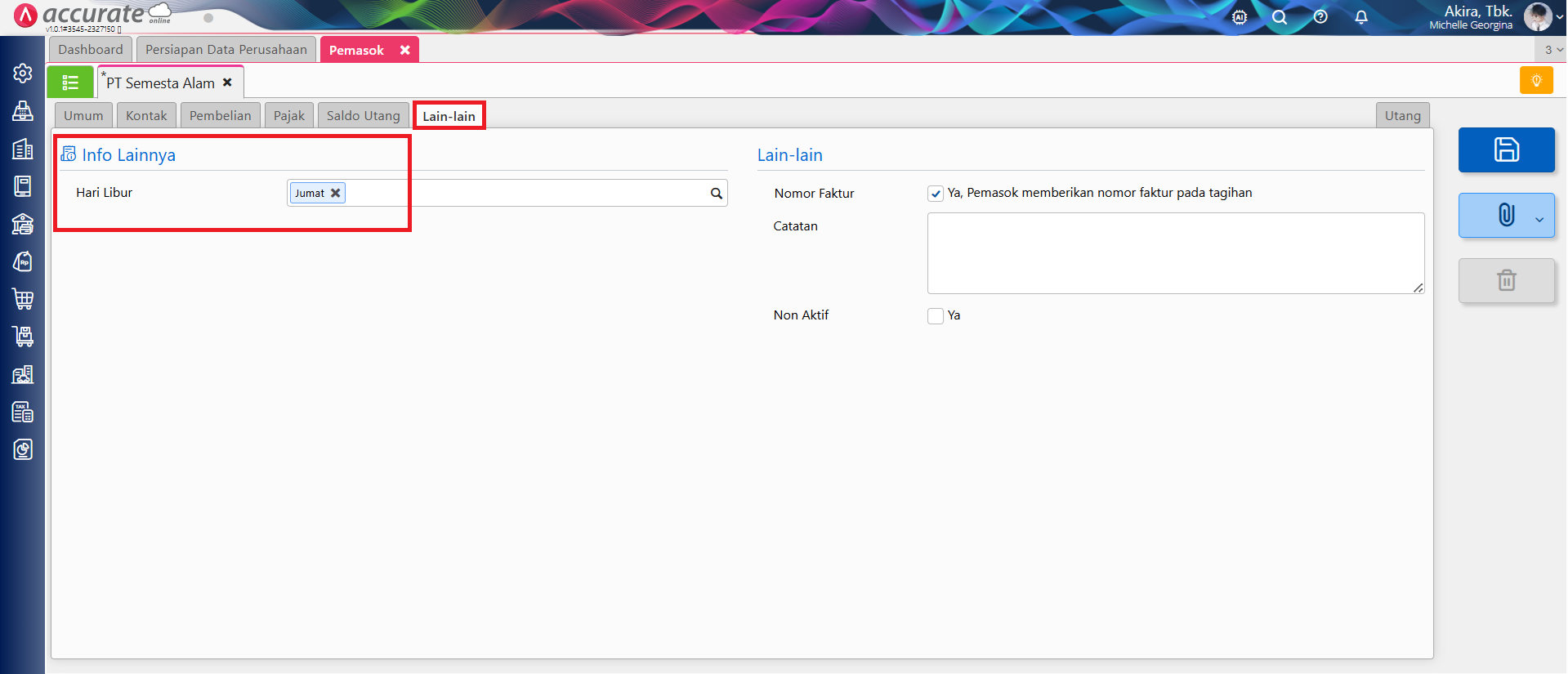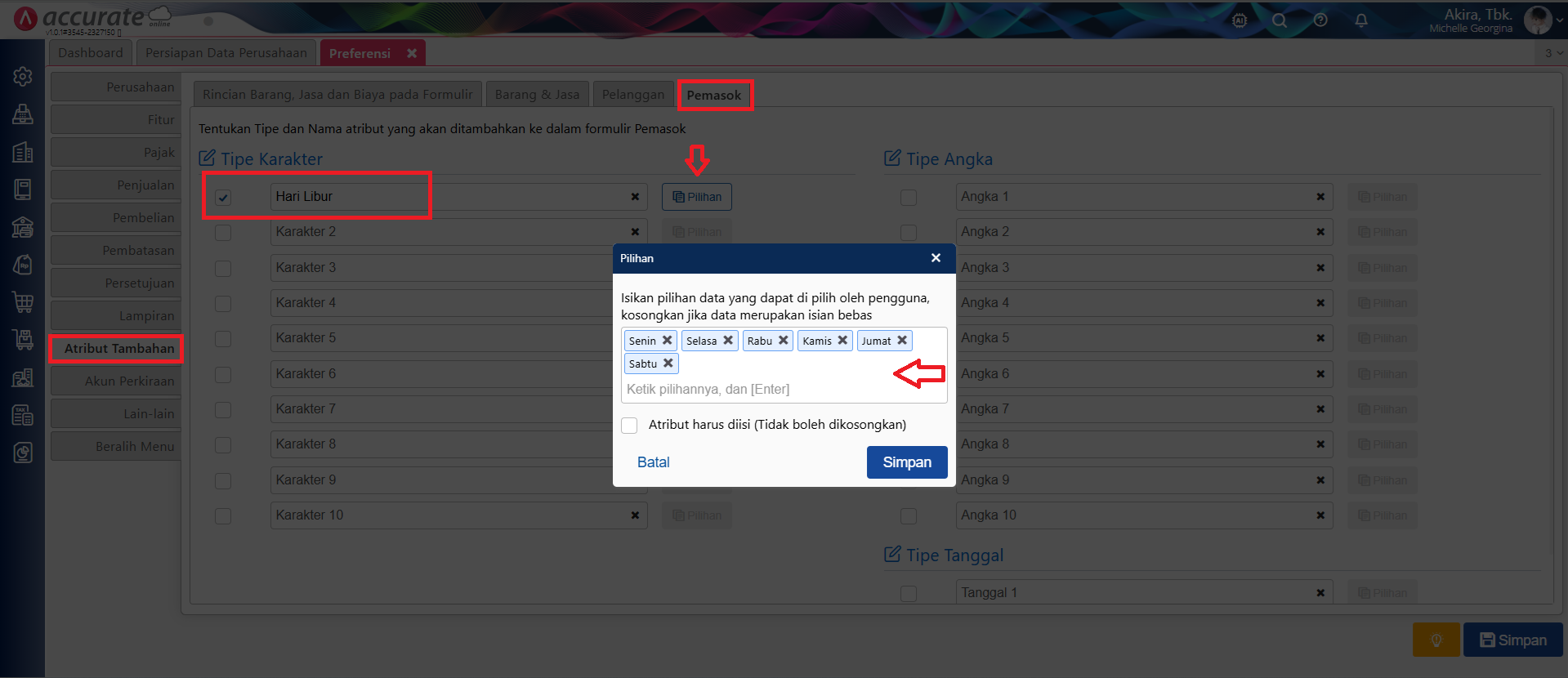 - Aktifkan tipe atribut tambahan pemasok yang ingin digunakan, kemudian lengkapi sesuai kebutuhan.