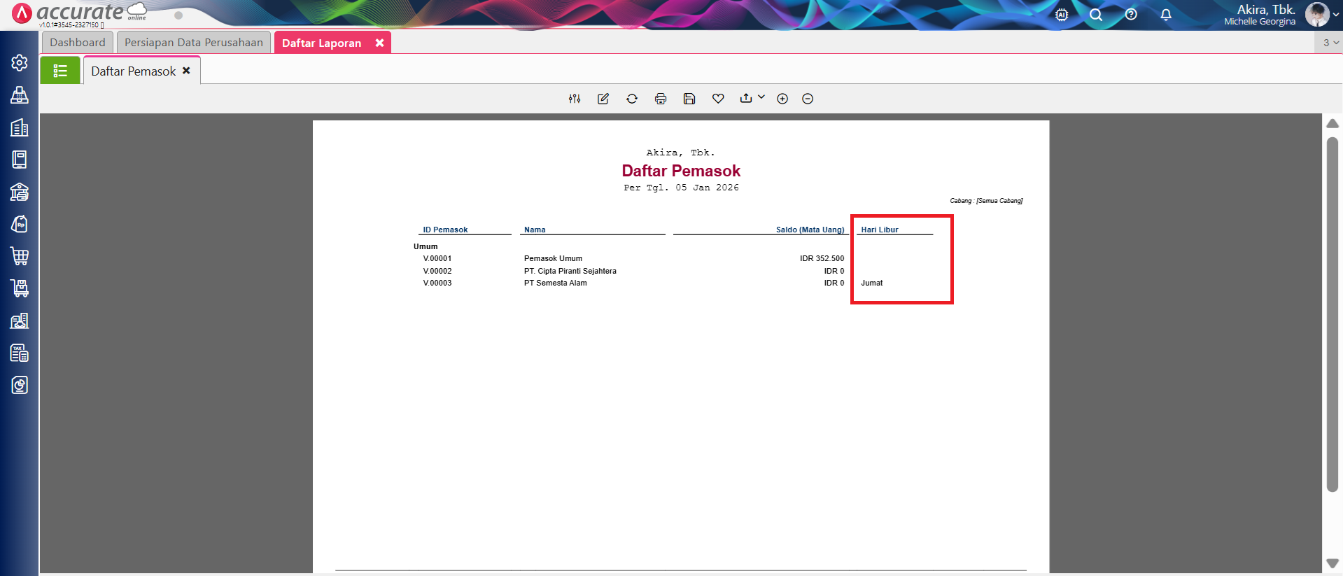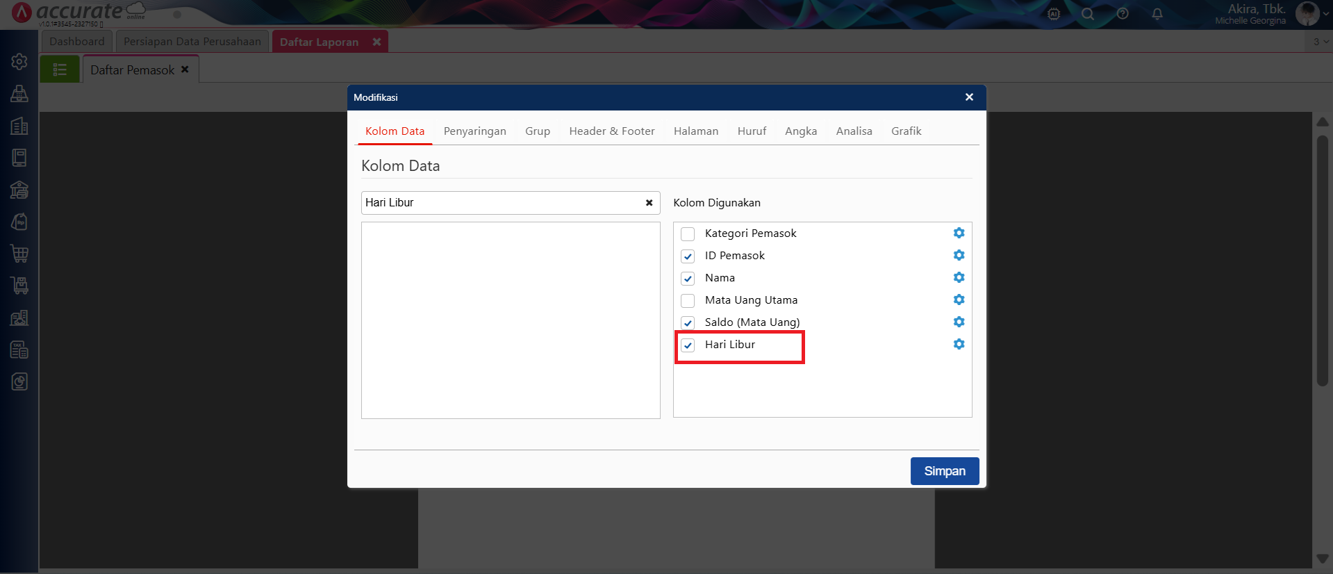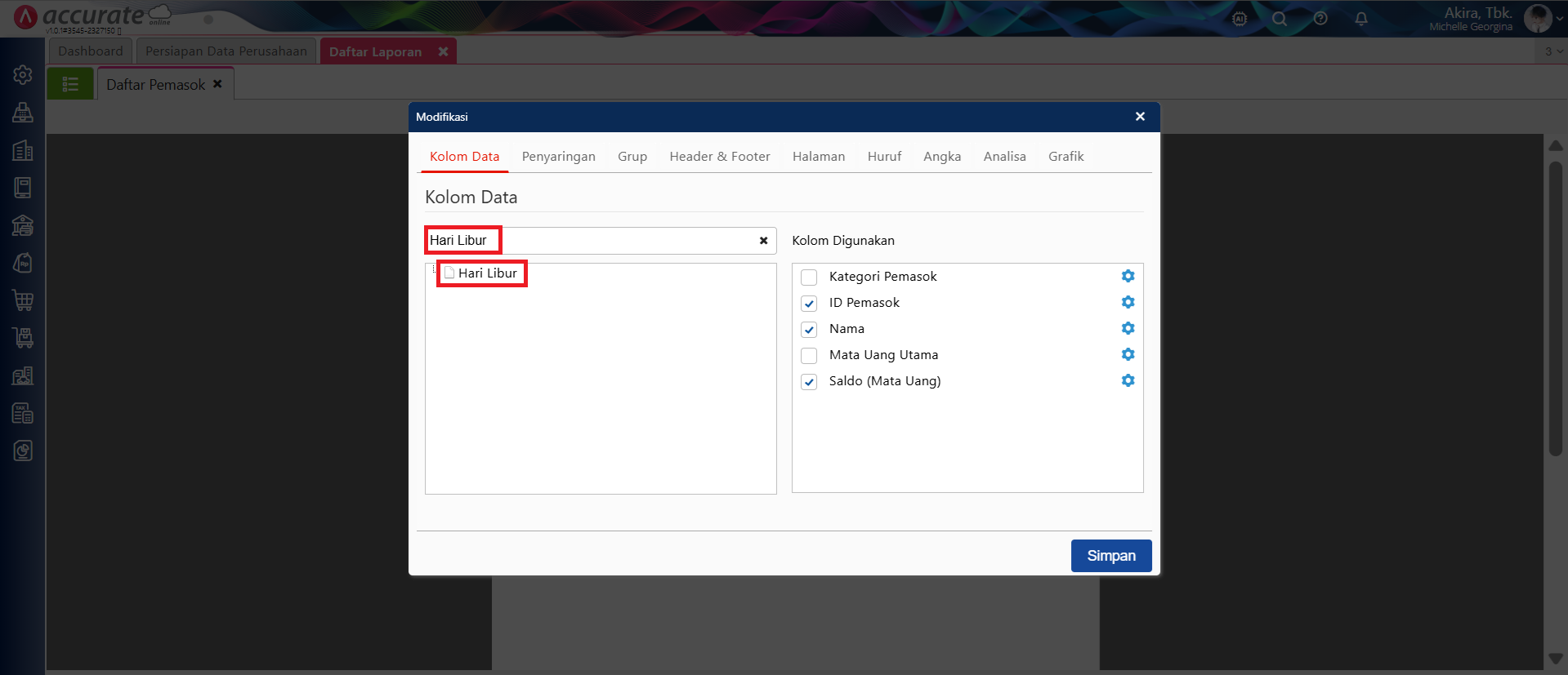 - Untuk menampilkan informasi Atribut Tambahan Pemasok pada Laporan, lakukan modifikasi pada laporan tersebut. Misalnya pada Laporan Daftar Pemasok, ke menu ‘Modifikasi’, cari nama atribut tambahan pada Kolom Data, klik 2x pada nama atribut tambahan tersebut sehingga tampil di Kolom Digunakan lalu Simpan.