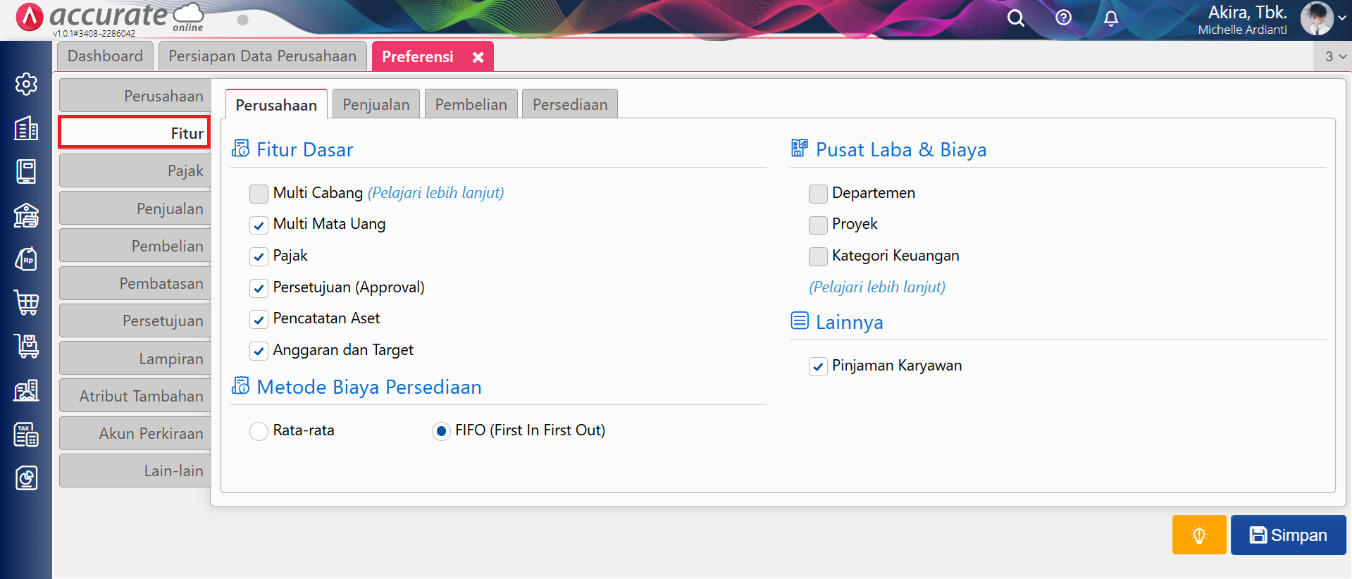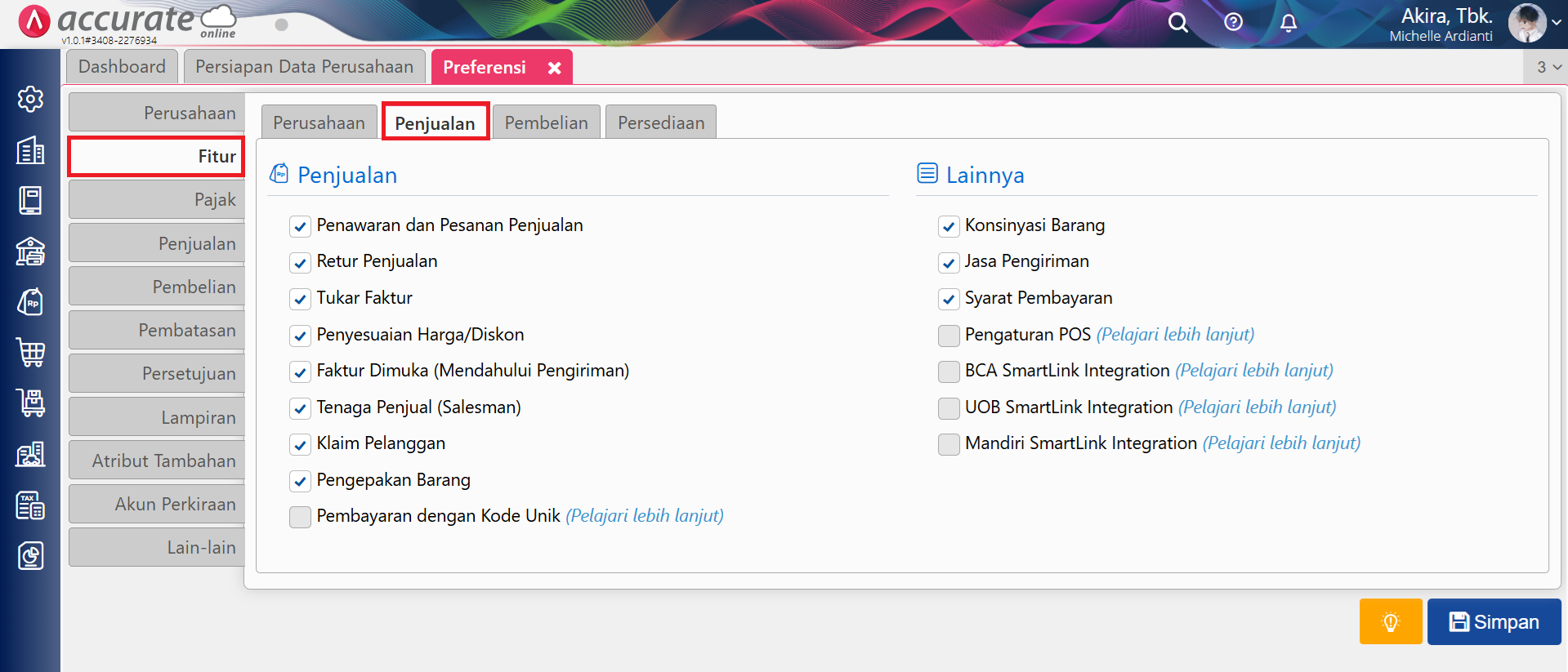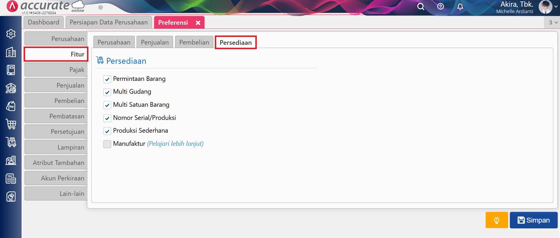 Menu Preferensi pada bagian Fitur, berfungsi untuk mengatur penggunaan fitur-fitur pada data usaha Accurate Online Anda. Fitur ini dibagi menjadi 4 bagian sesuai dengan fungsi-nya yaitu