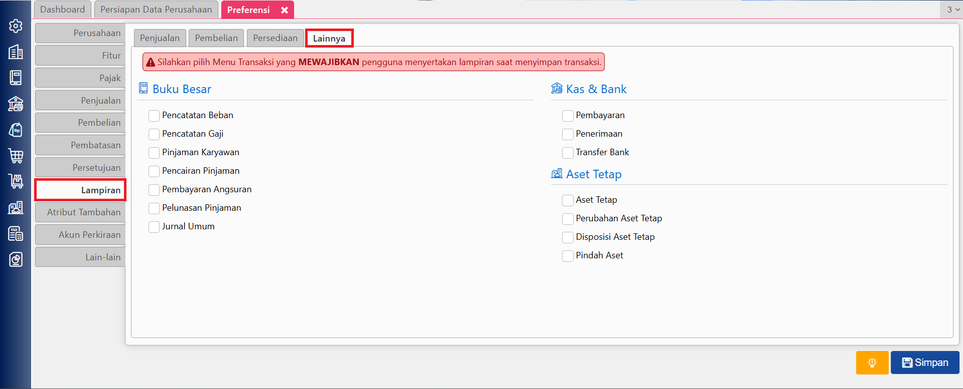 Fitur Lampiran di Pengaturan | Preferensi berfungsi untuk melakukan pengaturan pada menu transaksi yang diwajibkan menyertakan lampiran (dokumen) saat menyimpan transaksi. Jika ingin mengaktifkan fitur ini, silahkan beri tanda centang pada menu transaksi yang diinginkan, kemudian Simpan. Fitur ini terbagi menjadi 5 bagian yaitu sebagai berikut.
