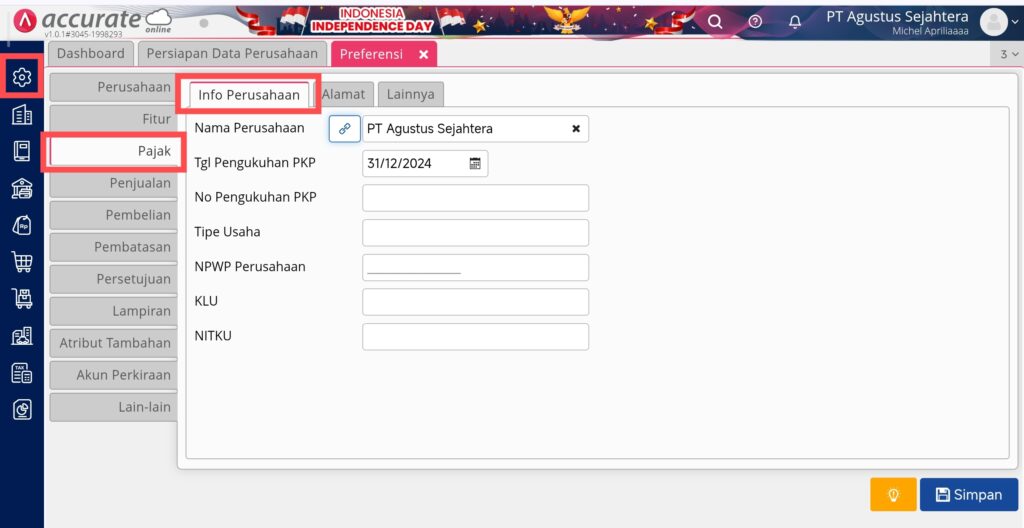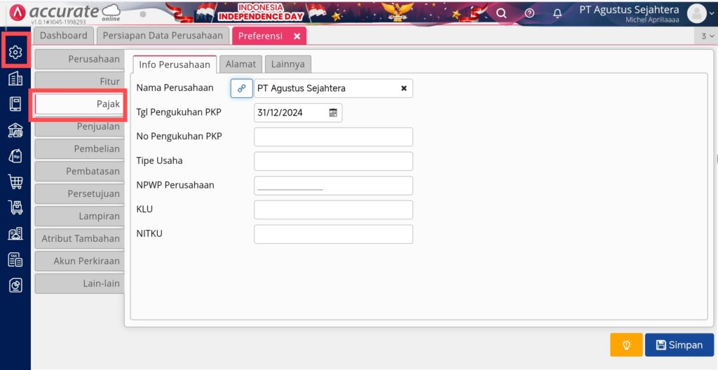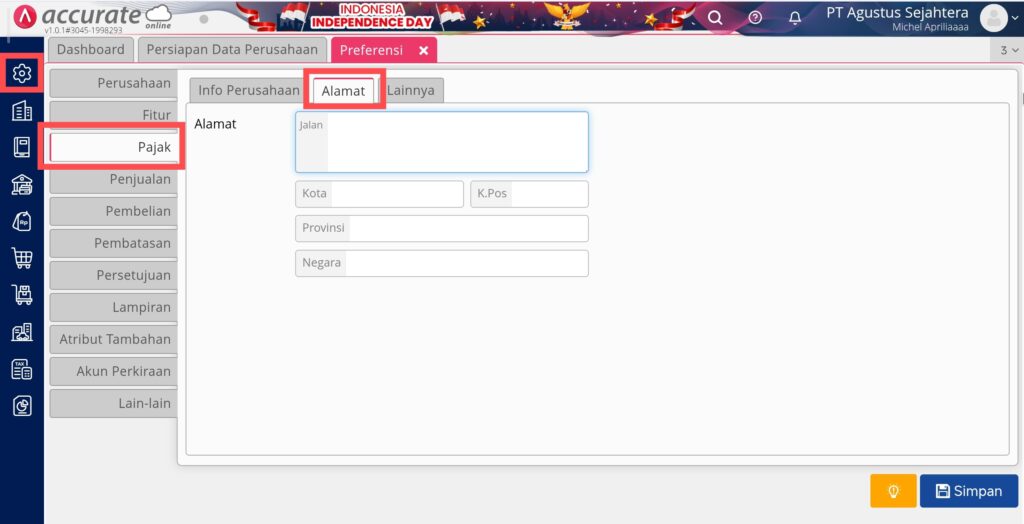 Pada bagian Pajak di menu Pengaturan | Preferensi, berfungsi untuk mengisikan informasi data pajak dari perusahaan atau bisnis Anda. Terdapat 3 bagian yaitu tab Info Perusahaan, Alamat, dan Lainnya.