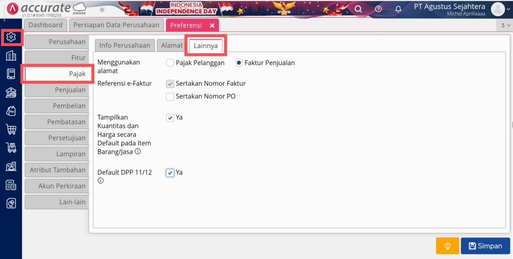 - Lainnya : pada tab lainnya, pengguna bisa menentukan beberapa pengaturan terkait pajak seperti menggunakan alamat berdasarkan pajak pelanggan atau faktur penjualan, referensi e-faktur, pengaturan untuk Tampilkan Kuantitas dan Harga secara Default pada Item Barang/Jasa, serta mengaktifkan default DPP 11/12.