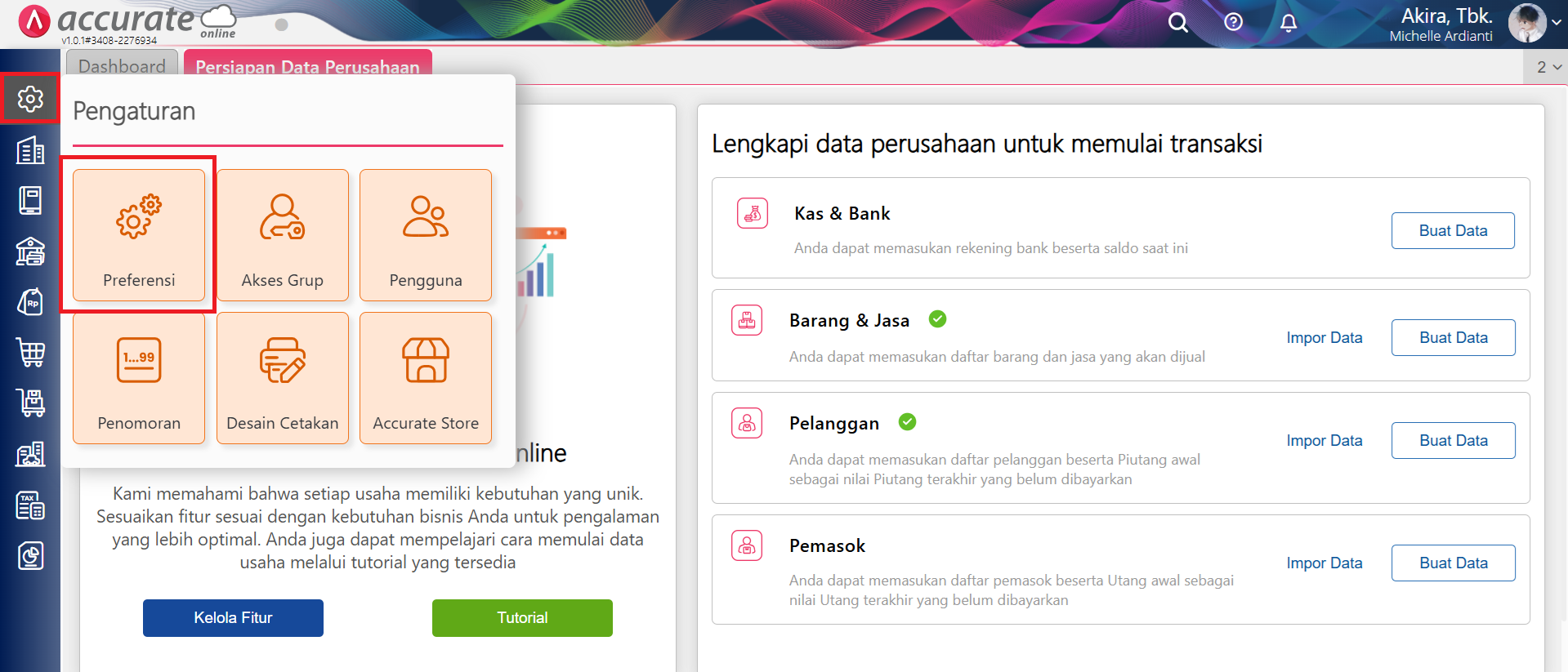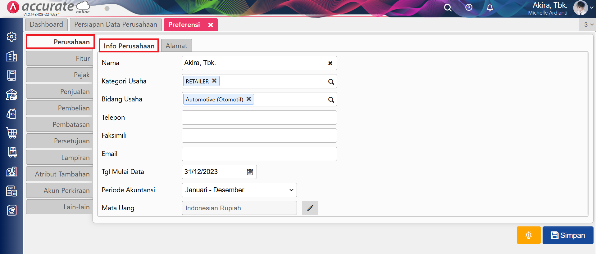 Pada menu Pengaturan | Preferensi | Perusahaan, merupakan menu untuk mengisikan informasi terkait perusahaan Anda, yang berfungsi untuk menampilkan data perusahaan Anda saat membuat transaksi pada data usaha Accurate Online Anda. Informasi perusahaan yang tampil secara default adalah sesuai dengan apa yang telah Anda isikan saat awal membuat data usaha baru.