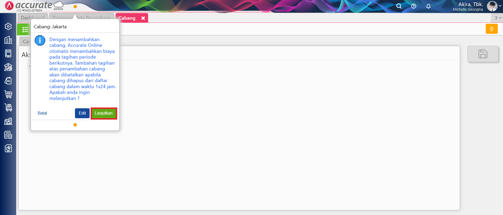 - Simpan dan akan tampil pesan konfirmasi bahwa penambahan cabang baru akan dikenakan biaya, klik ‘Lanjutkan‘ jika Anda menyetujui pengenaan biaya tambahan tersebut.