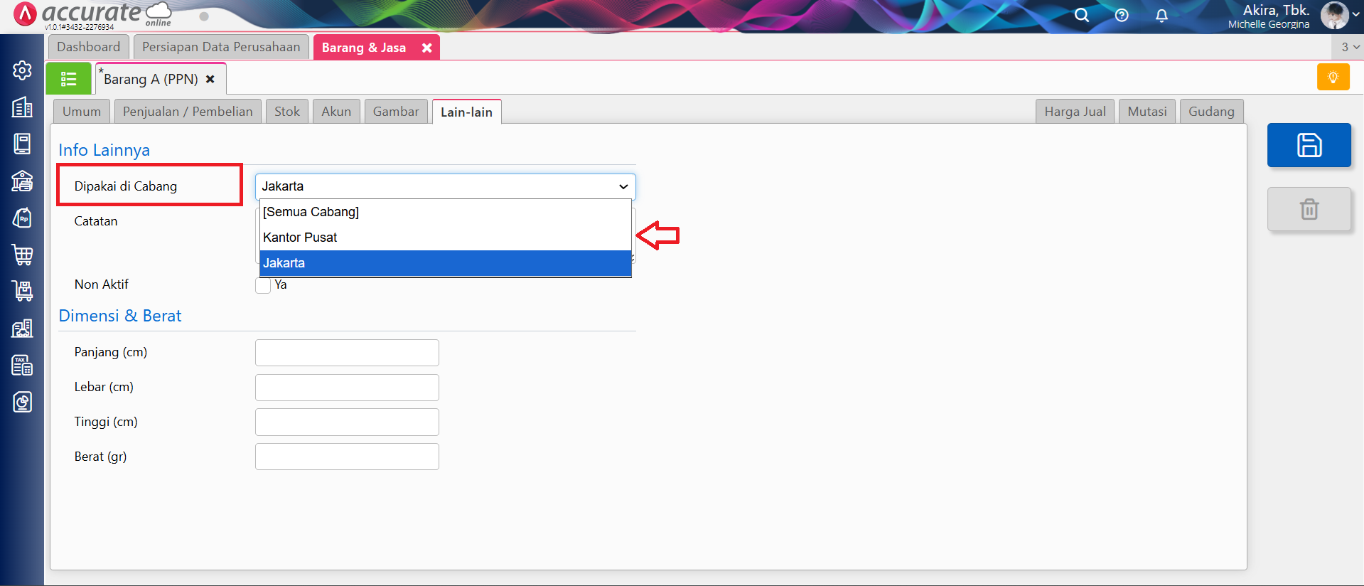 - Selanjutnya saat Anda membuat transaksi sesuai dengan cabang tersebut. Bagi pengguna yang memiliki akses ke beberapa cabang, perlu melakukan pemilihan nama cabang-nya. Atau Anda juga bisa menentukan nama cabang tertentu pada data Barang & Jasa, Pelanggan, Pemasok, Akun dsbnya.