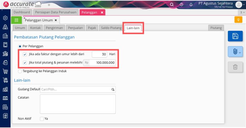 Artinya : Jika nanti Pelanggan A ingin berhutang ke PT. Nusantara lagi, namun ternyata masih ada nilai piutang yang belum lunas dan apabila dijumlahkan dengan nilai Faktur per sekarang lebih dari Rp100.000.000, maka Accurate akan mengeluarkan notifikasi “Pelanggan A telah melewati batas piutang. Total Piutang dan pesanan menjadi lebih dari Rp100.000.000”.Peringatan Pembatasan Nilai Piutang Pelanggan