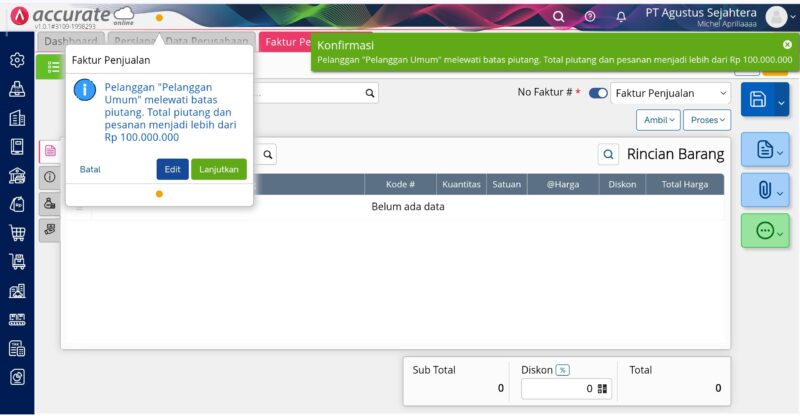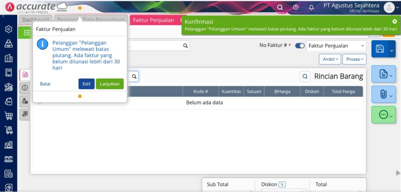 - Pada Pengguna Operator, hanya akan ada notifikasi “Batal” dan “Edit” saja. Kecuali jika Pengguna Operator diberikan Hak Akses untuk “Menjual melebihi limit piutang” pada Akses Grup, maka Pengguna Operator tersebut bisa membuat Faktur Penjualan yang sudah melebihi Pembatasan Piutang-nya.