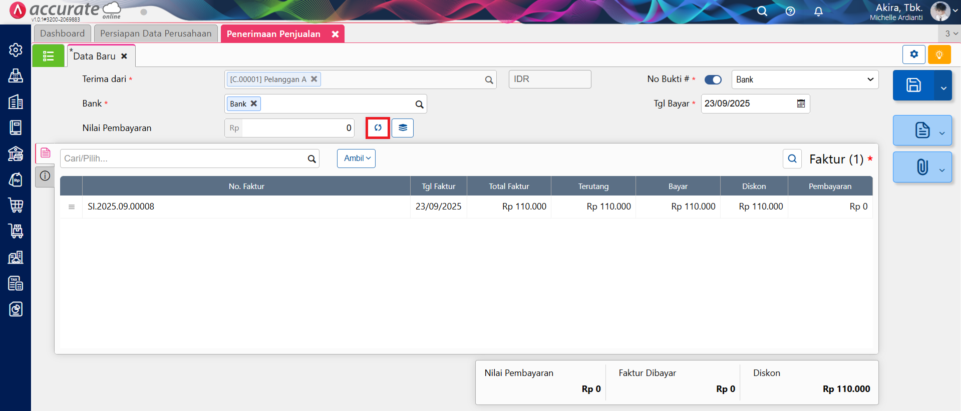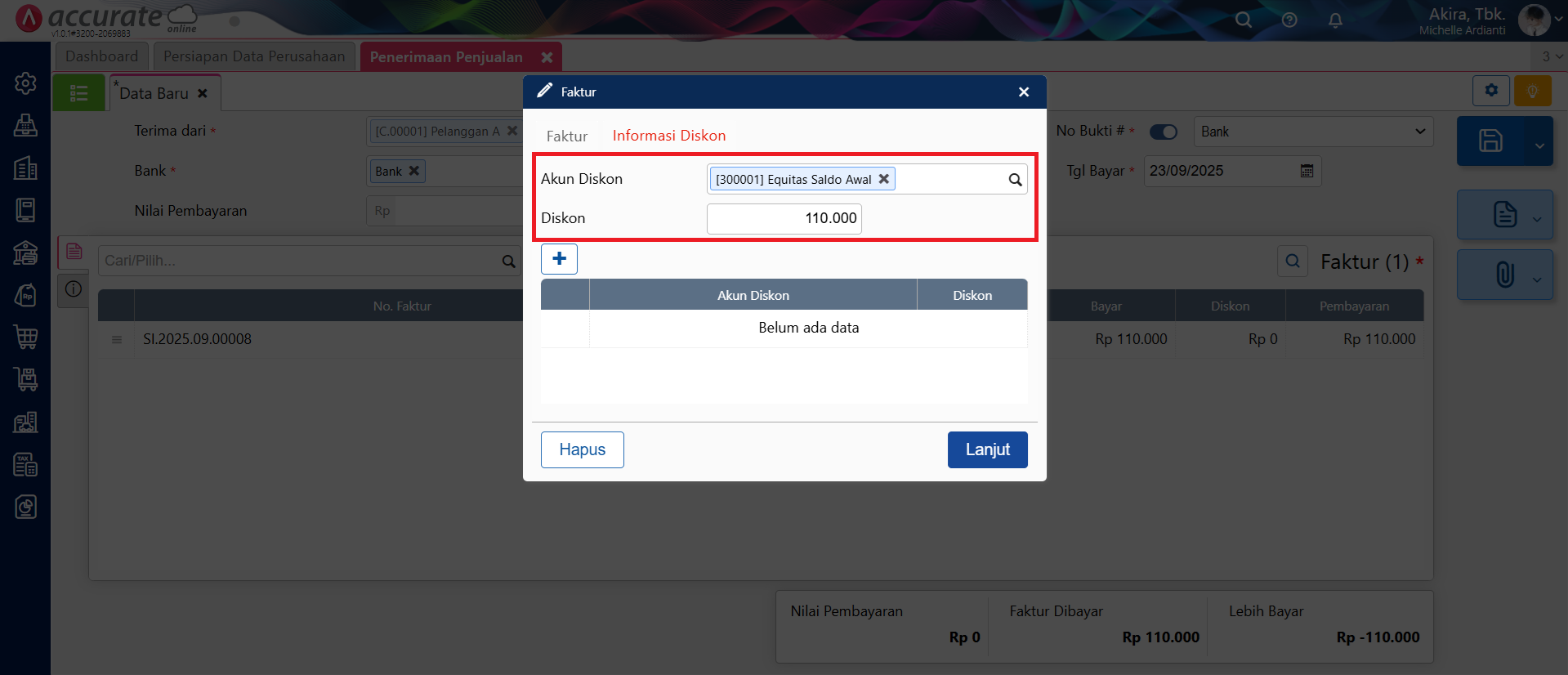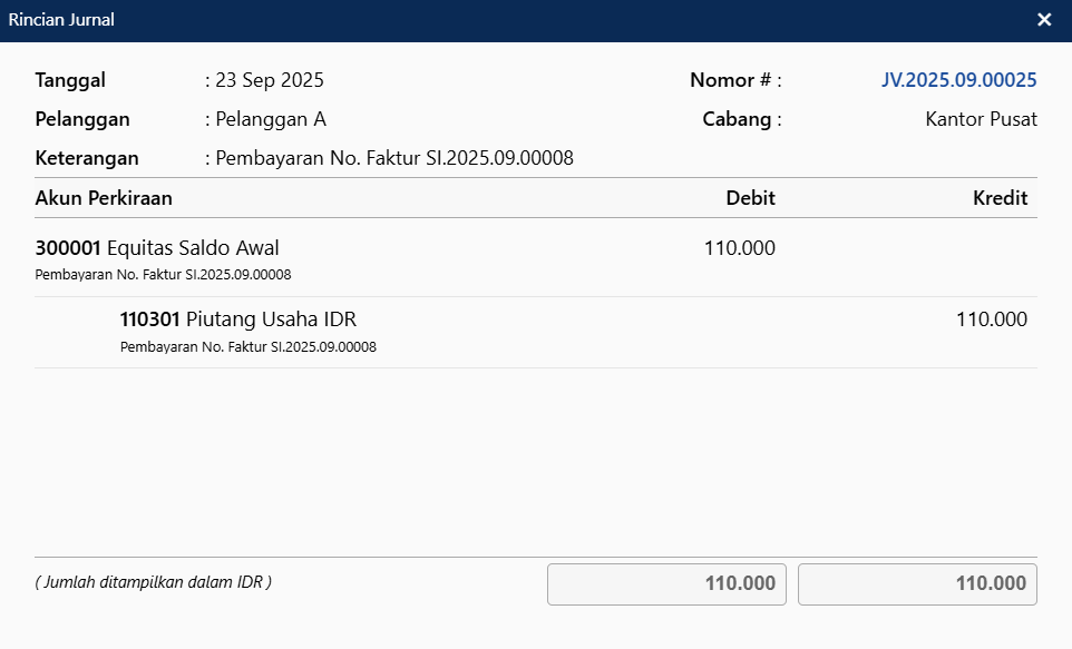 - Langkah terakhir adalah membuat transaksi Penerimaan Penjualan atas Faktur Penjualan tersebut, dan lakukan diskon penerimaan ke akun Equitas Saldo Awal, sehingga jurnal yang terbentuk adalah sebagai berikut.