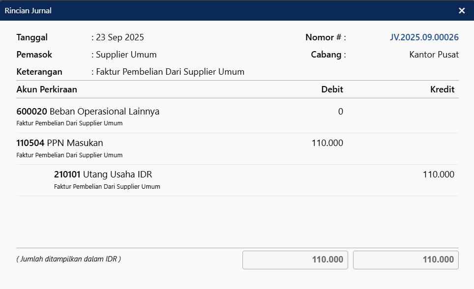 Jurnal transaksi Faktur Pembelian untuk saldo awal PPN Masukan