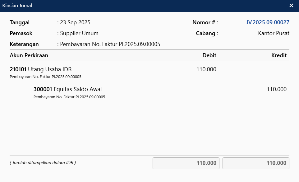 Jurnal Pembayaran Pemasok atas Faktur saldo awal PPN Masukan