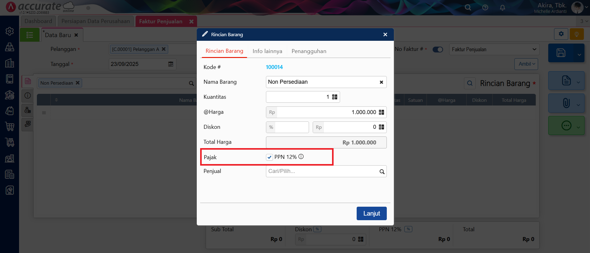 - Selanjutnya, buat transaksi Faktur Penjualan melalui menu Penjualan | Faktur Penjualan, dan pilih Pelanggan atas transaksi PPN Keluaran tersebut. Lalu, pilih barang Non Persediaan yang telah dibuat di langkah 1 dan isikan Harga Barang dengan nilai DPP-nya, lalu klik Lanjut.