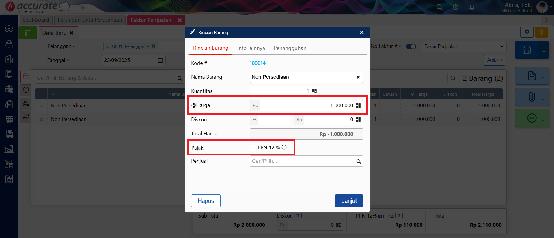 - Masih di formulir Faktur Penjualan, pilih kembali barang Non Persediaan tersebut, kemudian isikan harga barang-nya dengan nilai minus dari DPP, yaitu Rp – 1.000.000 dan jangan centang informasi ‘PPN’-nya, lalu klik Lanjut.