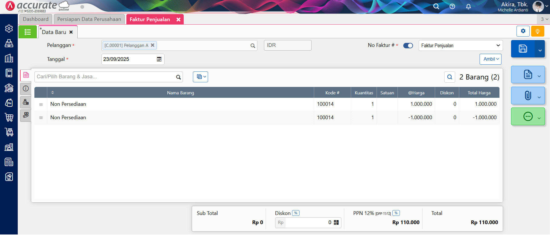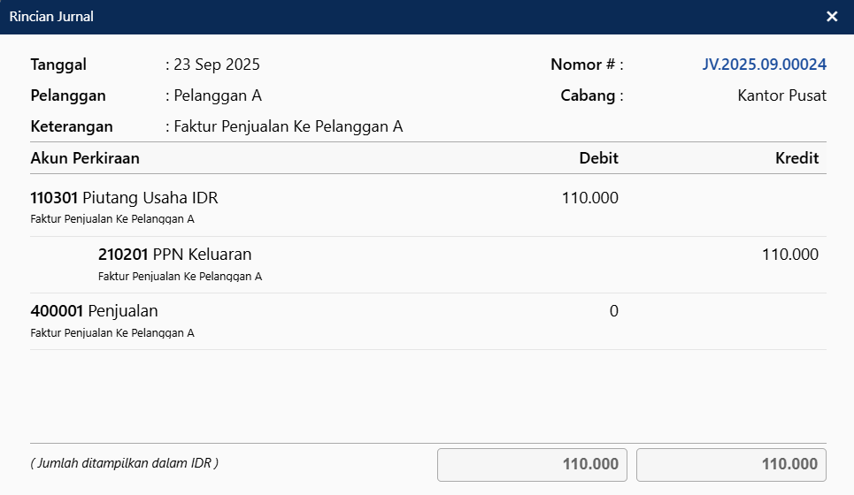- Sehingga pada formulir Faktur Penjualan tersebut akan tampil senilai PPN-nya saja, yaitu sebesar Rp 110.000 (lihat gambar).