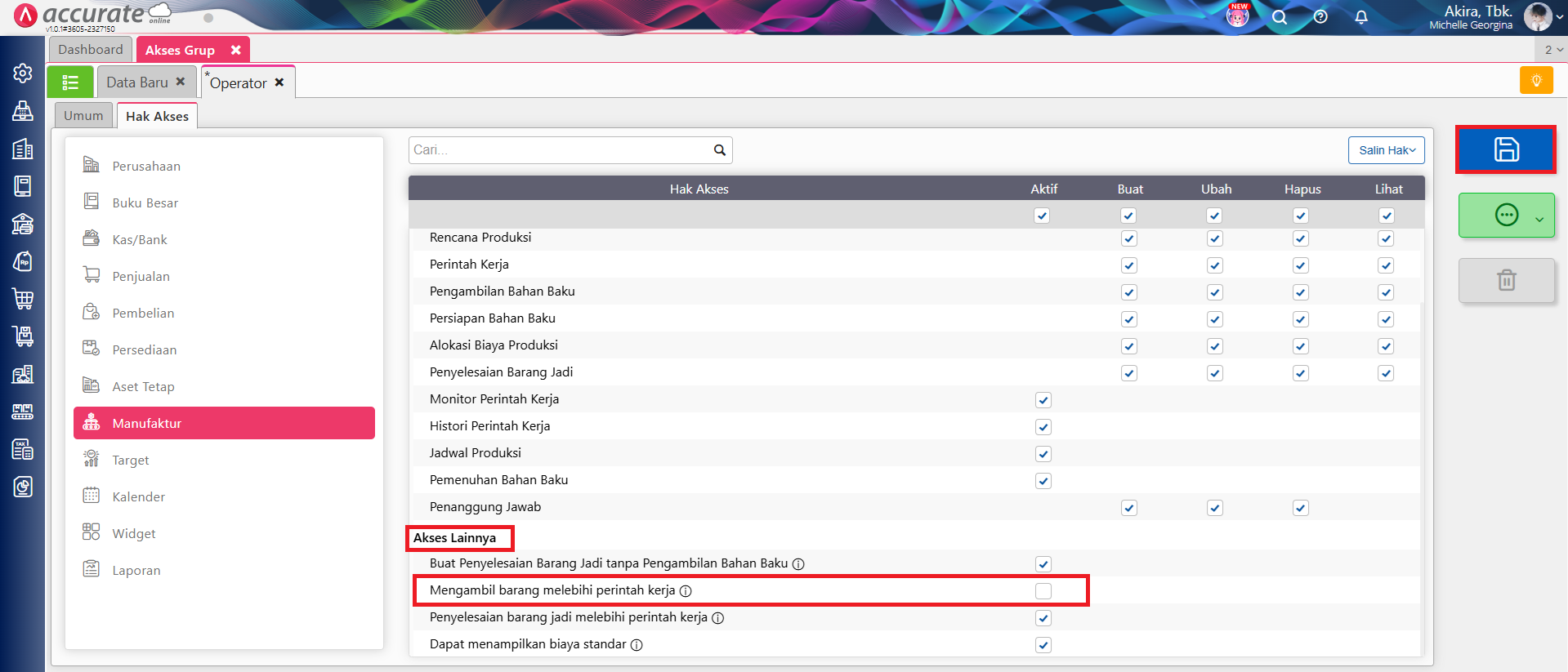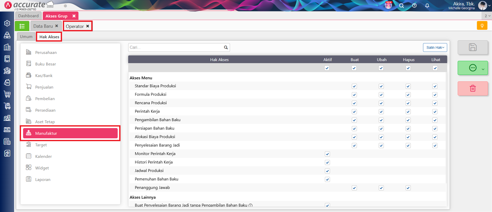 3. Kemudian ke tab Hak Akses, klik pada Manufaktur.