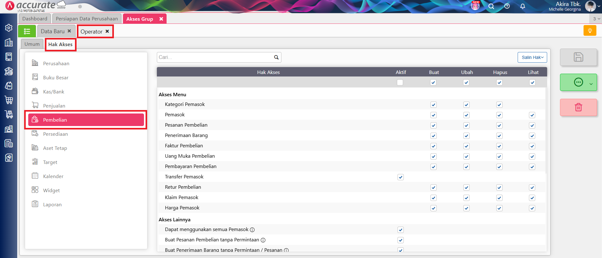 - Kemudian ke tab Hak Akses, klik pada Pembelian.