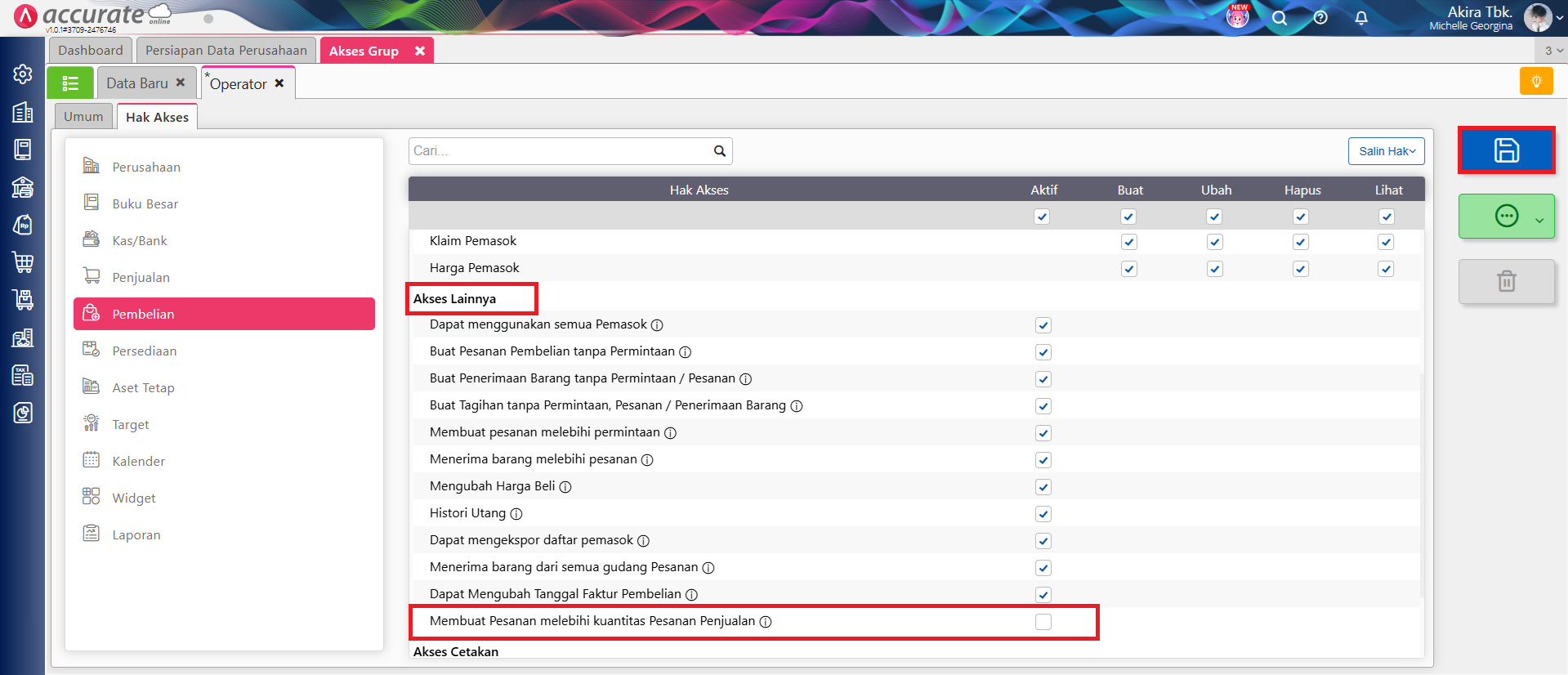 Berikut ini adalah langkah-langkah untuk melakukan pengaturan hak akses bagi pengguna level operator agar tidak bisa membuat pesanan pembelian melebihi kuantitas pesanan penjualan: