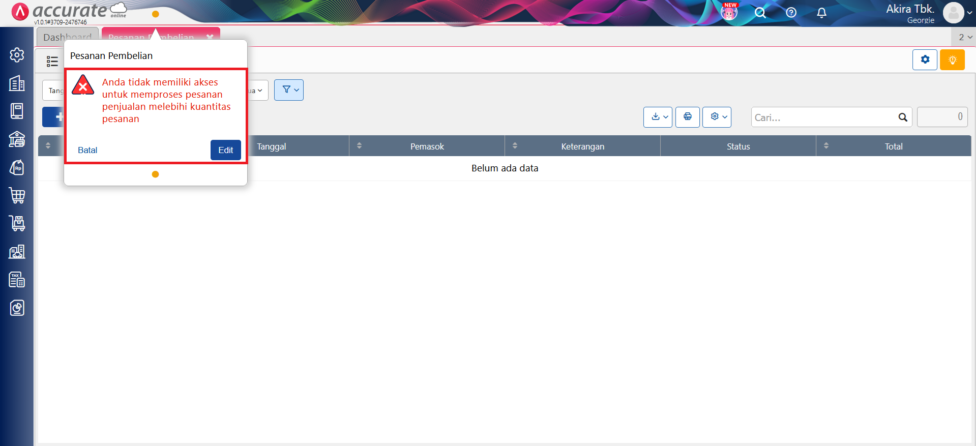 - Maka, jika pengguna level operator yang terdapat pada akses grup tersebut membuat Pesanan Pembelian melebihi kuantitas di Pesanan Penjualan, maka akan tampil notifikasi error seperti berikut.