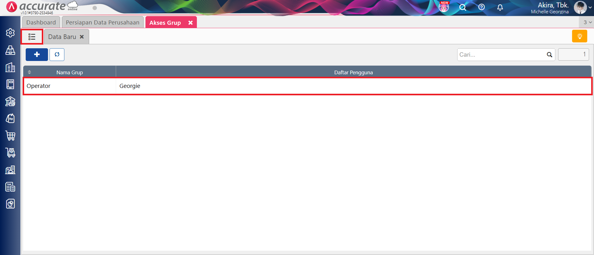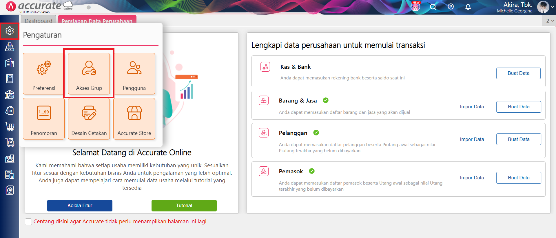 - Akses database Accurate online dengan pengguna level Administrator, kemudian ke menu Pengaturan | Akses Grup.