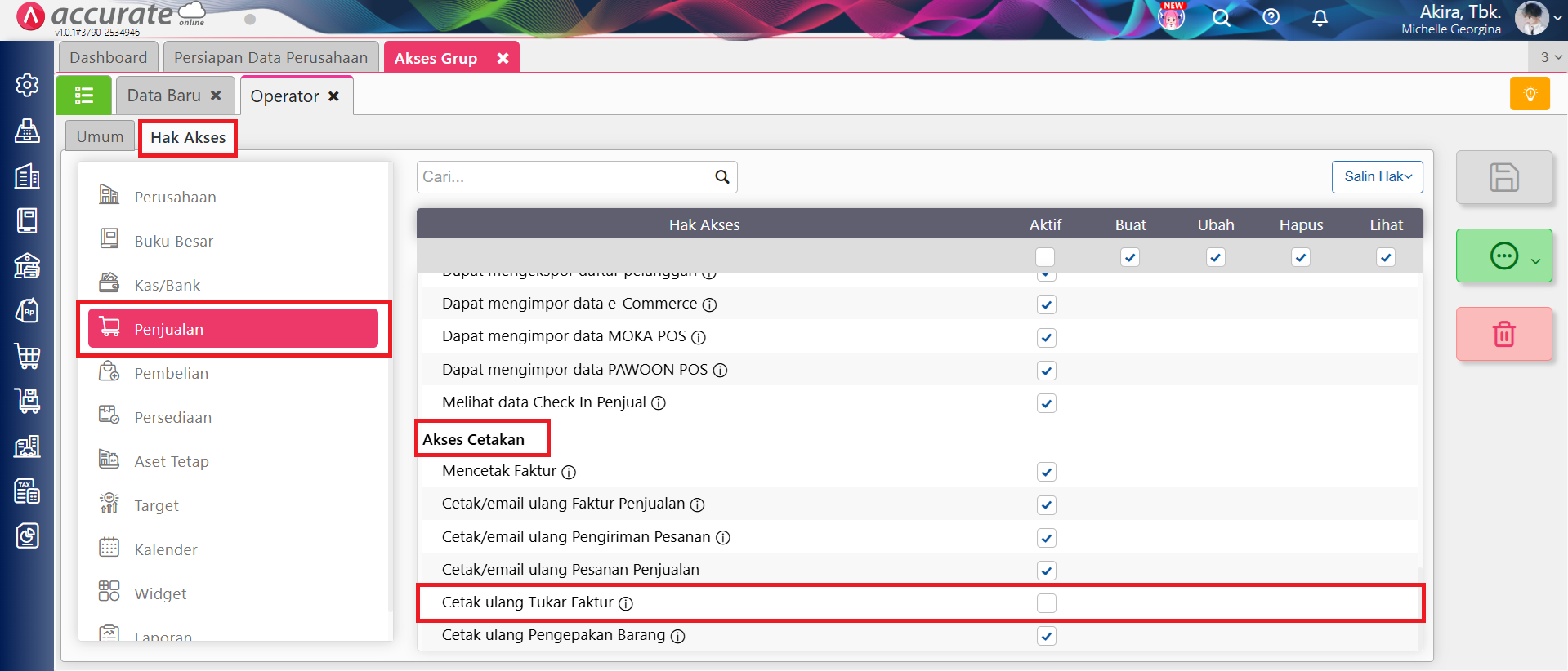 - Selanjutnya ke tab Hak Akses | Penjualan, pada bagian Akses Cetakan jangan centang informasi “Cetak Ulang Tukar Faktur“, lalu klik Simpan.