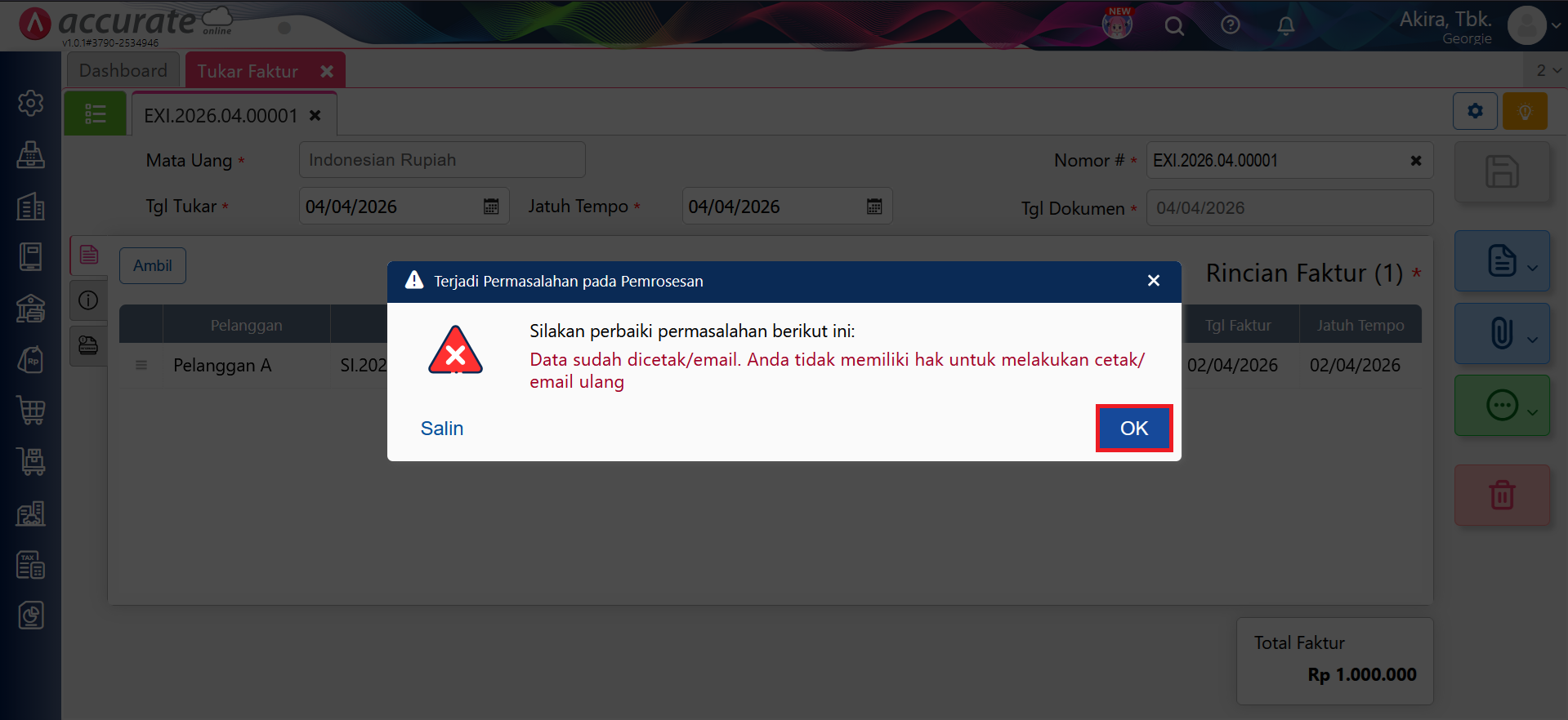 - Jika pengguna level Operator pada Akses Grup tersebut melakukan cetak ulang Tukar Faktur, maka akan tampil pesan error seperti pada gambar dibawah.