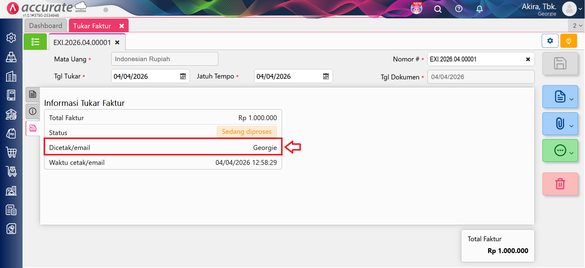 Catatan: Pada formulir transaksi Tukar Faktur, yaitu pada tab Informasi Tukar Faktur akan ditampilkan informasi nama pengguna yang telah melakukan cetak/email transaksi Tukar Faktur tersebut.