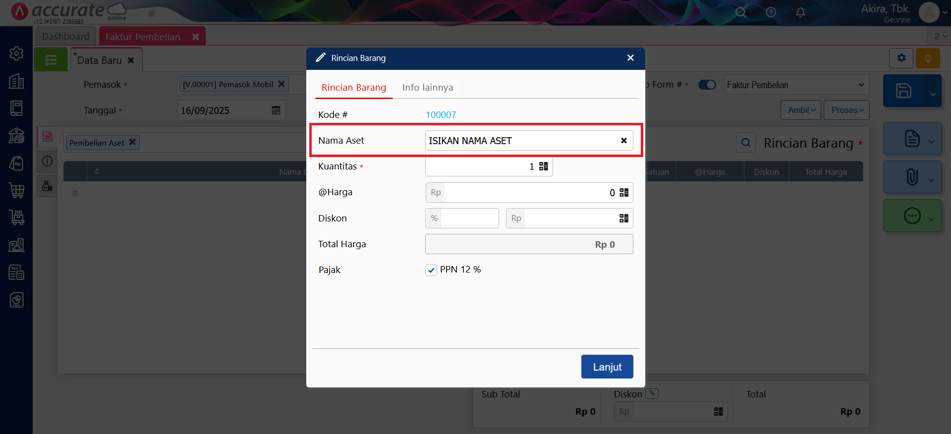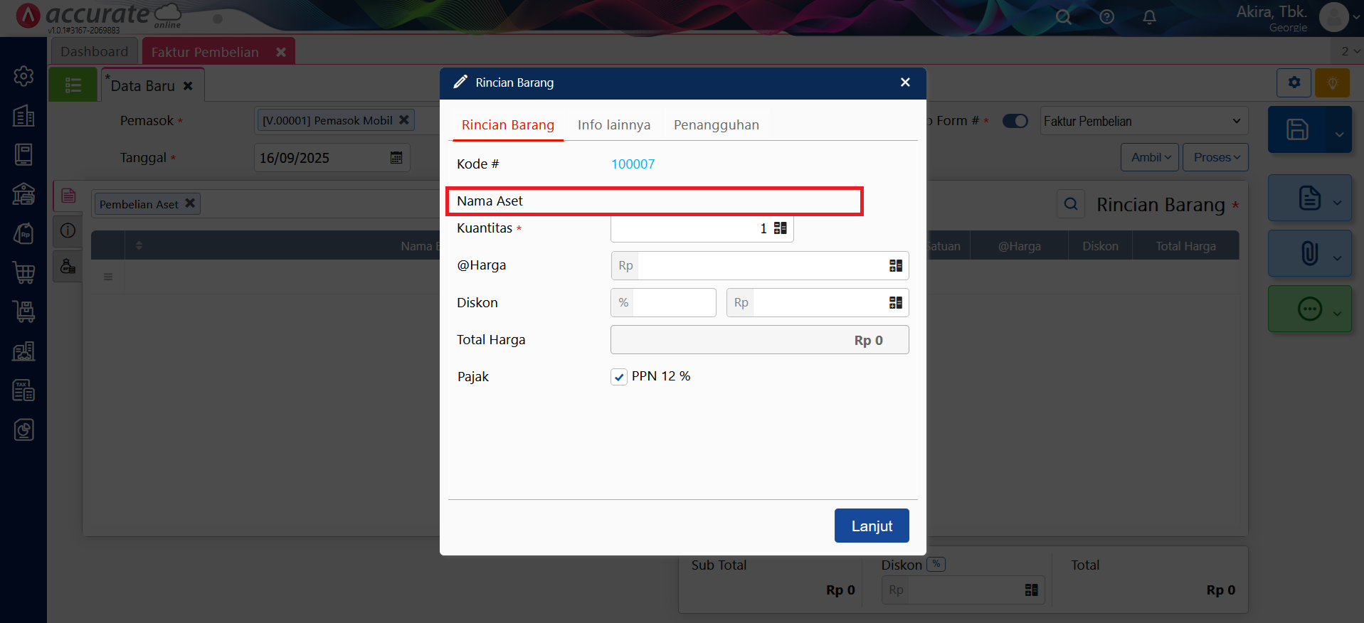 4. Setelah dilakukan pengaturan tersebut, untuk pengguna yang sudah diberikan akses ini bisa masuk kembali ke database yang bersangkutan, dan buat transaksi Faktur Pembelian untuk pembelian Aset Tetap Baru, seharusnya sudah bisa melakukan pengubahan Nama Aset Tetap sesuai kebutuhan.