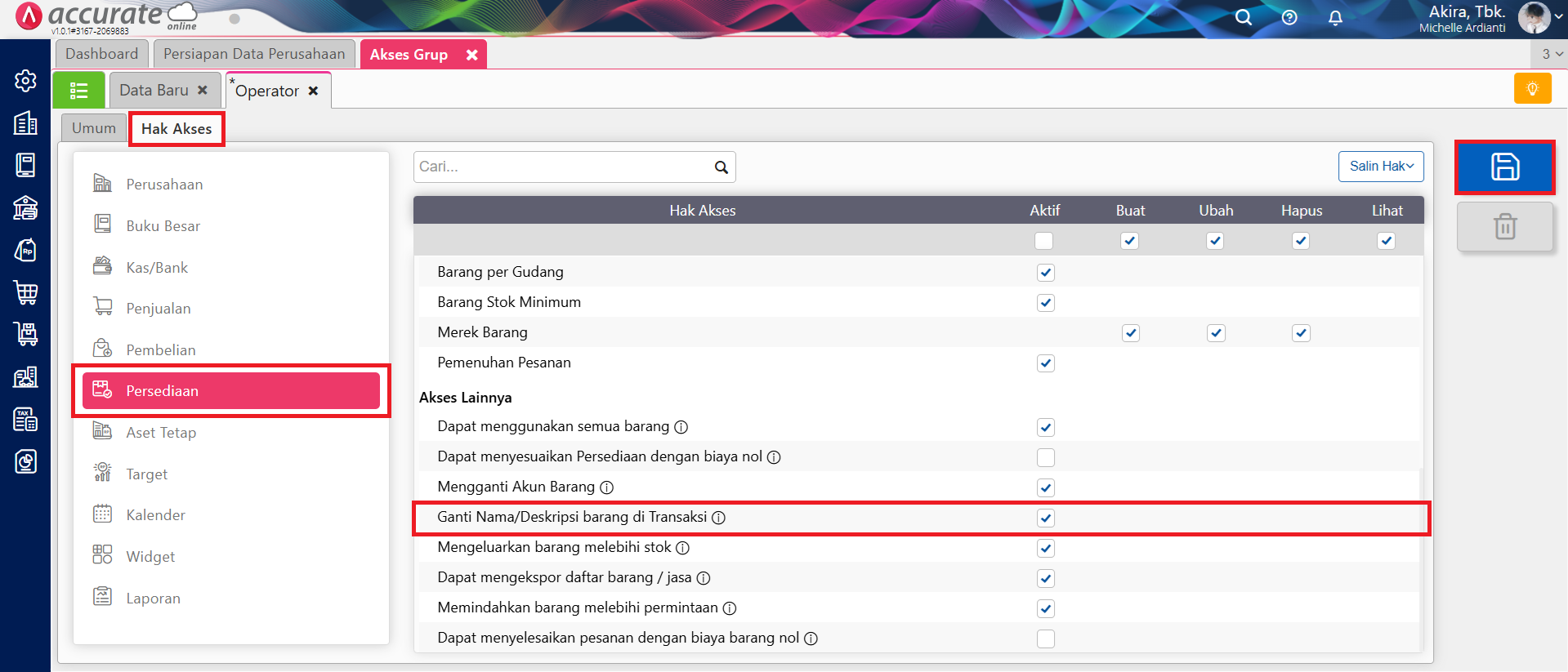3. Jika sudah klik Akses Grup pengguna yang dimaksud, selanjutnya ke tab Hak Akses | Persediaan | Akses Lainnya, centang informasi ‘Ganti Nama/Deskripsi barang di Transaksi‘ lalu klik Simpan.