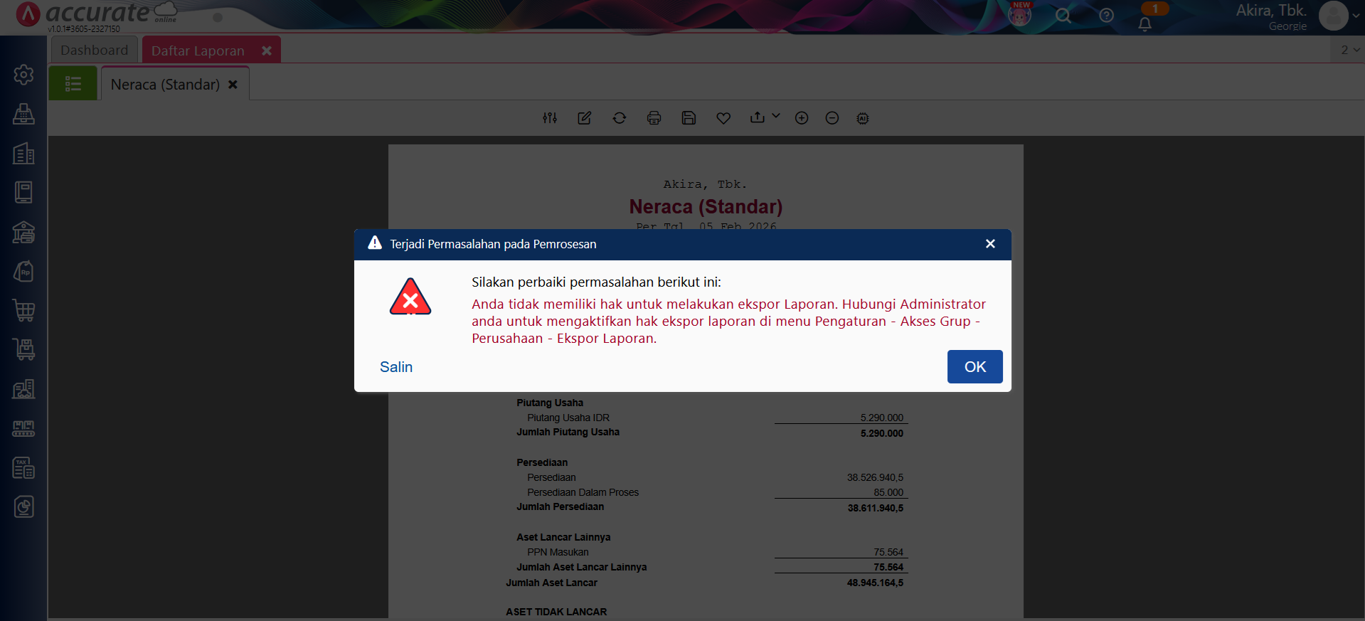 - Setelahnya, bagi pengguna pada Akses Grup tersebut, saat akan melakukan ekspor laporan pada database tersebut, akan tampil pesan eror seperti pada gambar berikut ini.