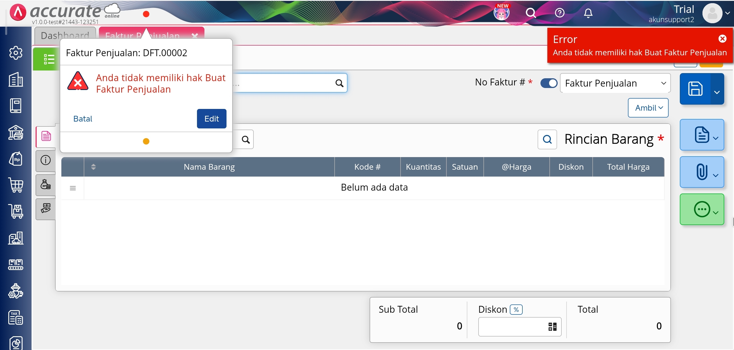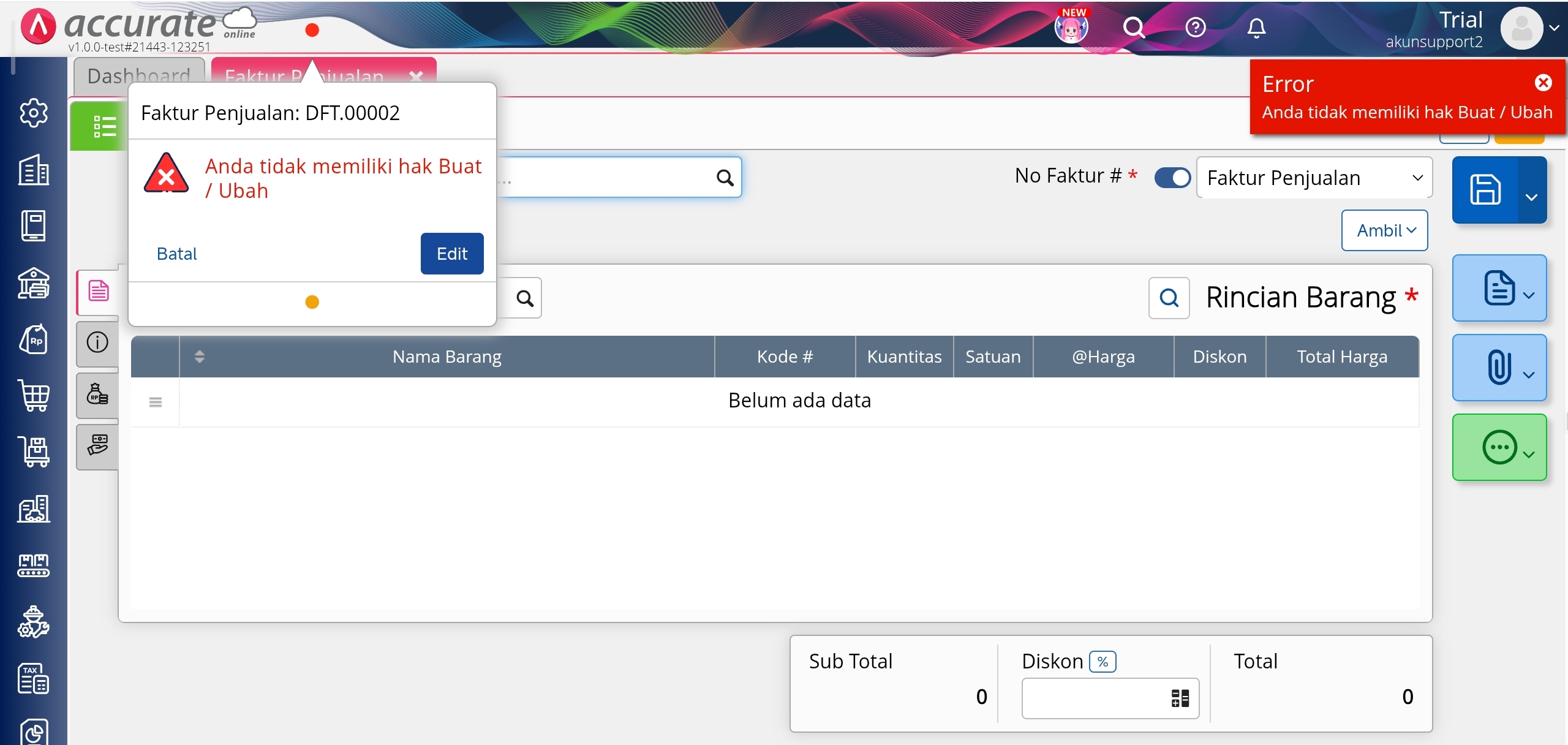Hak akses buat dan ubah transaksi Faktur Penjualan
