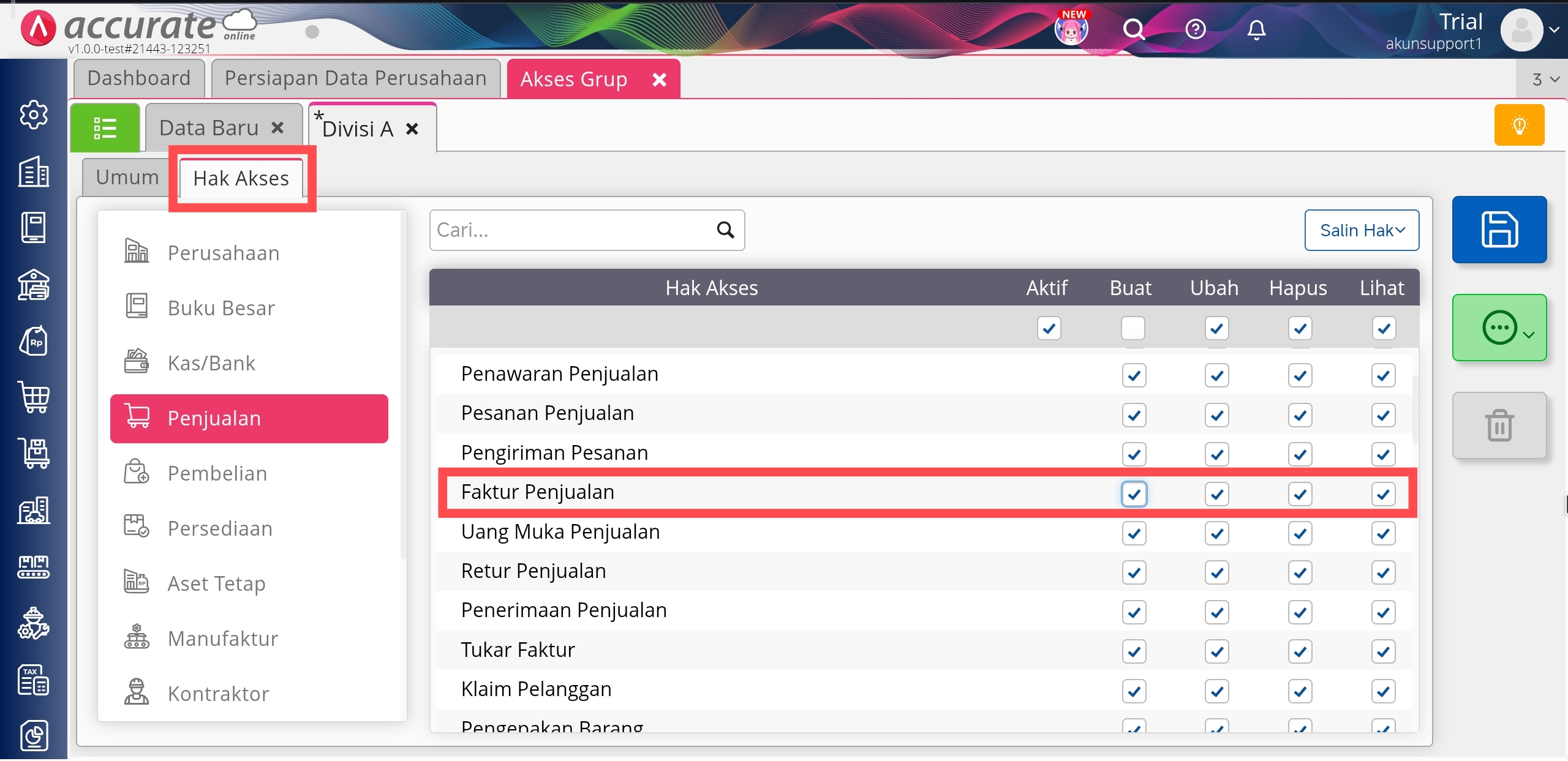 4. Pada tab Hak Akses, pilih bagian Penjualan, kemudian centang informasi Buat dan Ubah pada Faktur Penjualan.