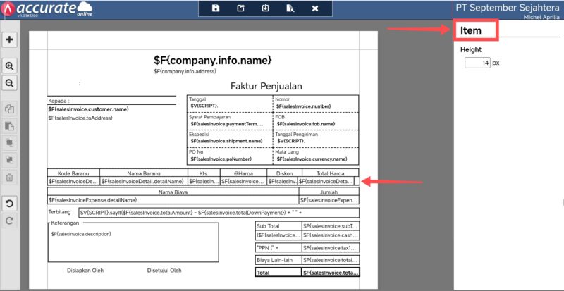 - Arahkan kursor dan klik (1 kali) pada variabel yang ada di Tabel Barang, contohnya adalah variabel detail total price. Kemudian geser kolom variable total price tersebut hingga ada area kosong pada Tabel Barang. Klik pada area kosong, hingga panel berubah informasinya dengan judul Item.