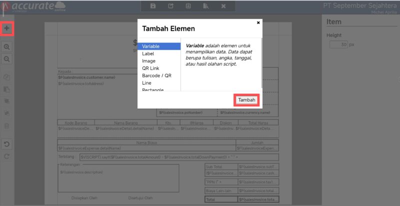 - Selanjutnya Tambah Elemen Variable dengan klik tombol (+), lalu pilih Variable, dan klik Simpan. Letakan dibawah variabel skrip Nama Barang (seperti gambar terlampir).