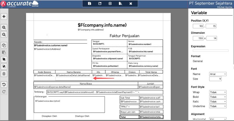 - Jika Anda ingin ditampilkan horizontal (sejajar) dalam satu tabel maka pada rumus variabel pertama bisa ditambahkan simbol + diikuti variabel tambahan, contoh : $F{salesInvoiceDetail.detailName}+$F{salesInvoiceDetail.detailNotes}