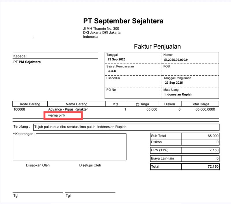 - Setelah itu simpan desainer, maka pada saat Anda mencetak faktur penjualan yang menambahkan keterangan di rincian barang seperti di atas, tampilannya seperti gambar di bawah ini.