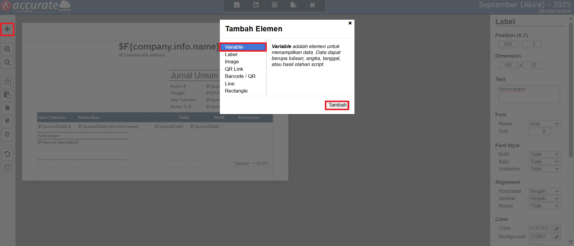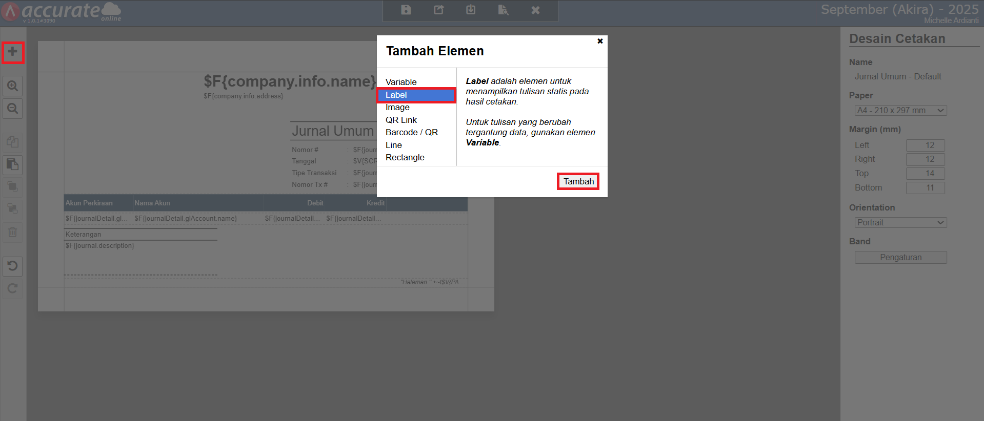 - Selanjutnya, klik tombol Tambah Element (icon +) | Label, klik Tambah dan posisikan kolom Label tersebut pada bagian Detail Account, dan berikan nama (misal, Keterangan).