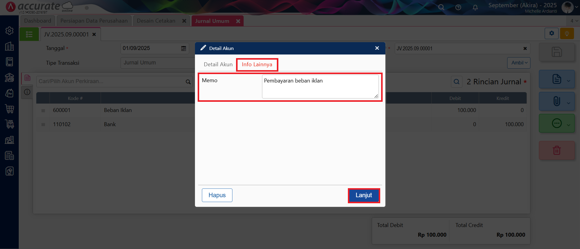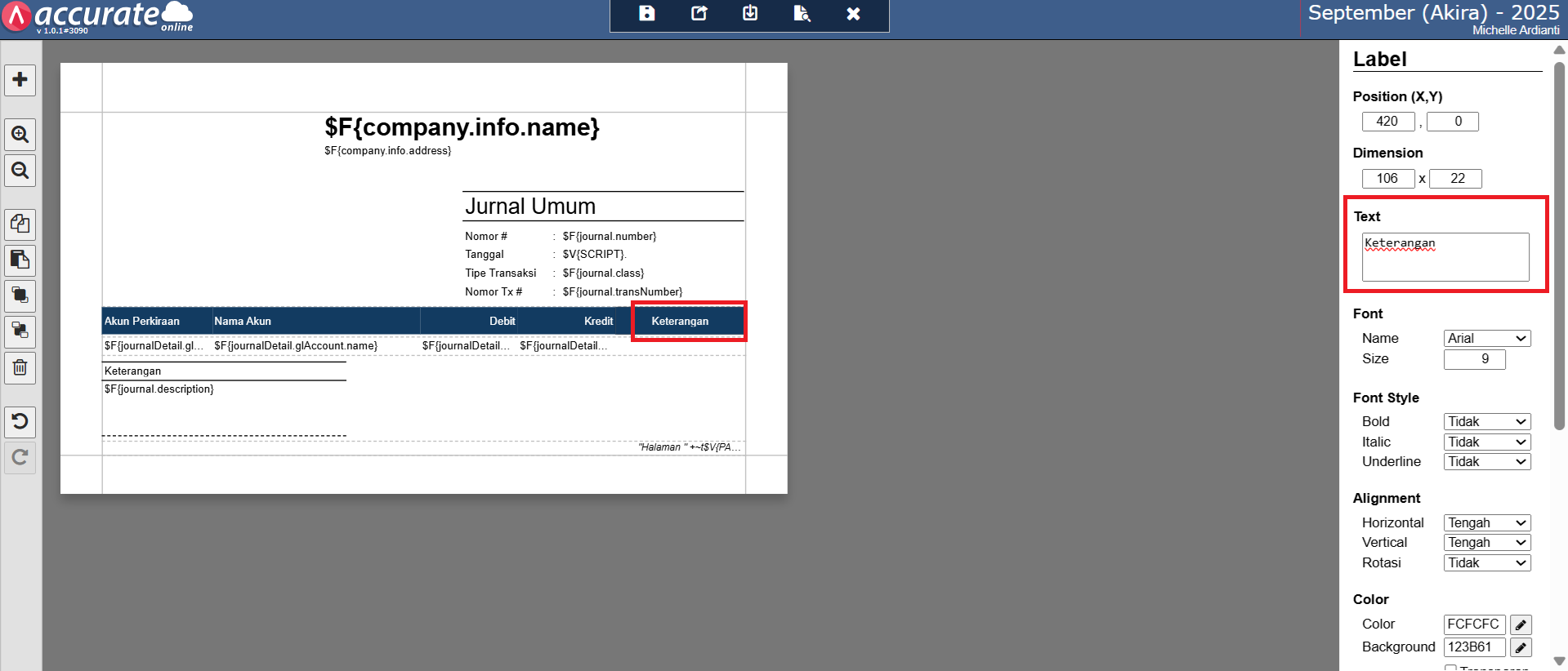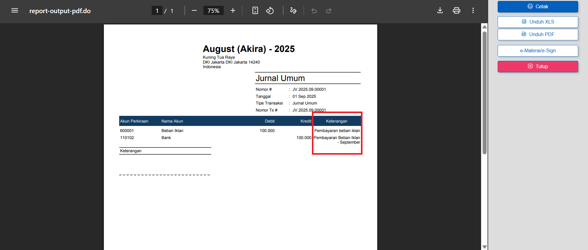 Berikut panduan menampilkan keterangan detail akun pada desain cetakan Jurnal Umum :