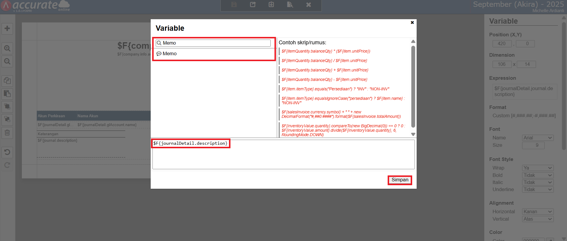 - Klik dua kali kolom variable yang sudah ditambahkan sebelumnya, dan lakukan pencarian atas variable ‘Memo‘ pada kolom pencarian. Klik variable ‘Memo‘ hingga tampil informasi $F{journalDetail.description} dan klik Simpan.
