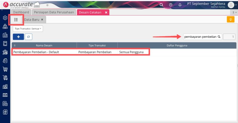 - Buka daftar Desain Cetakan dengan klik tombol daftar di samping tab Data Baru, lalu cari dan buka desain cetakan Pembayaran Pembelian yang dimaksud.
