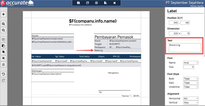- Tambahkan Label Baru dengan klik tombol (+), pilih Label dan klik Tambah, kemudian atur Dimension sesuai kebutuhan, lalu letakkan pada bagian Header dan isikan dengan nama yang sesuai misalnya adalah Rekening.