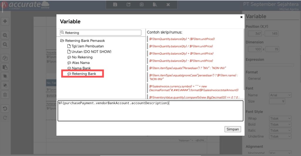 - Kemudian klik 2 kali pada kolom variable tersebut, dan cari variabel skrip untuk Rekening Pemasok pada kolom pencarian, lalu pilih variable rekening pemasok yang akan ditampilkan, misalnya ingin menampilkan No. Rekening dan Informasi Banknya, maka klik 2x pada variable Rekening Bank, sehingga tampil rumus skrip variabel berikut ini : $F{purchasePayment.vendorBankAccount.accountDescription}.