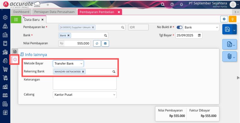 Berikut langkah-langkah menampilkan informasi rekening pembayaran pemasok pada Desain Cetakan Pembayaran Pembelian :