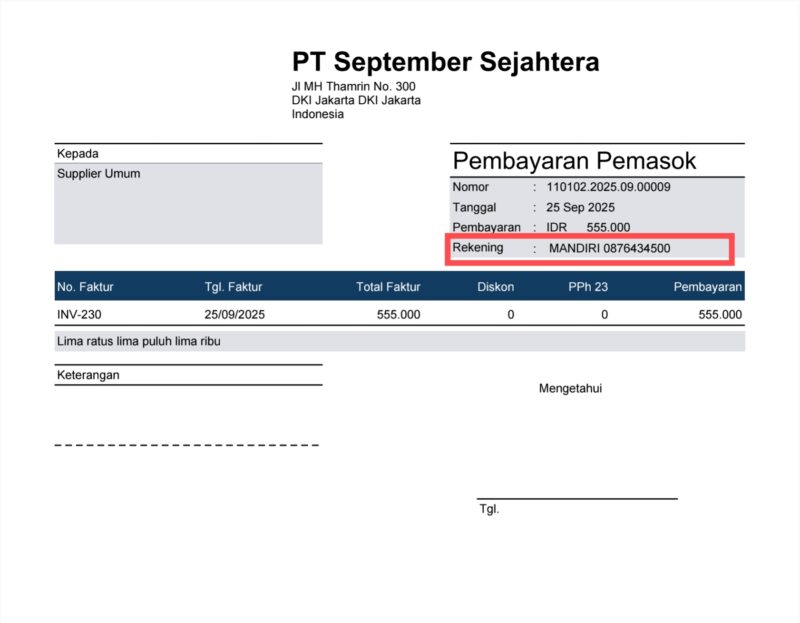 Hasil Cetak Dengan Menampilkan Informasi Rekening Pemasok