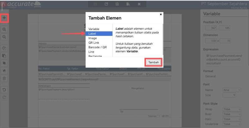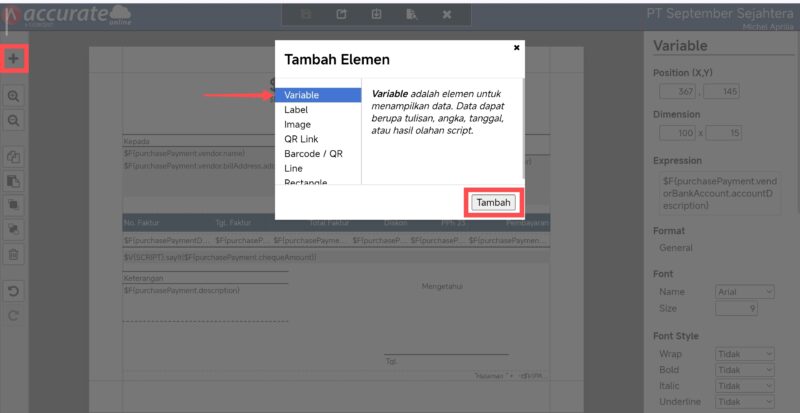- Tambahkan Variabel baru dengan klik tombol (+), lalu pilih elemen Variable dan klik Tambah, dan letakkan di samping label yang sudah dibuat sebelumnya.