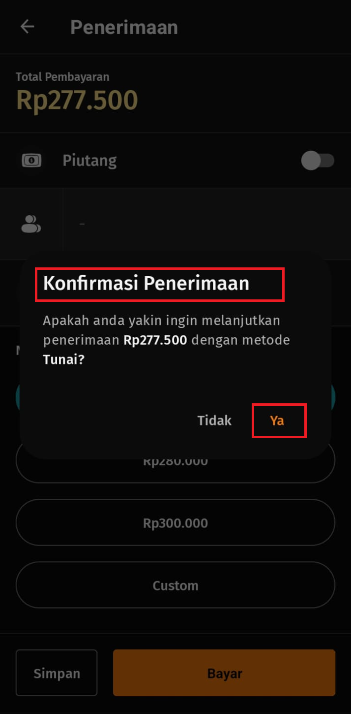 - Sehingga, pada saat membuat pelunasan di Accurate POS, maka akan tampil Konfirmasi Penerimaan seperti berikut ini.