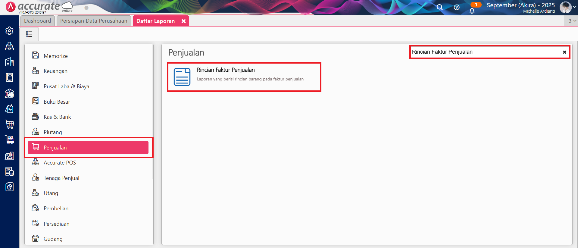 Lakukan pencarian atas laporan Rincian Faktur Penjualan