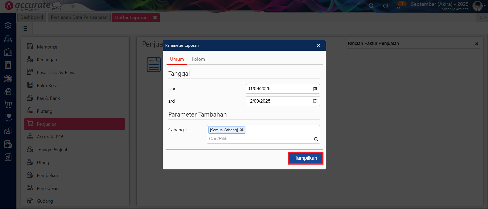 - Buka laporan Rincian Faktur Penjualan melalui menu Daftar Laporan | Daftar Laporan | Penjualan | Rincian Faktur Penjualan, kemudian atur parameter Tanggal dan Cabang sesuai kebutuhan, lalu klik Tampilkan.