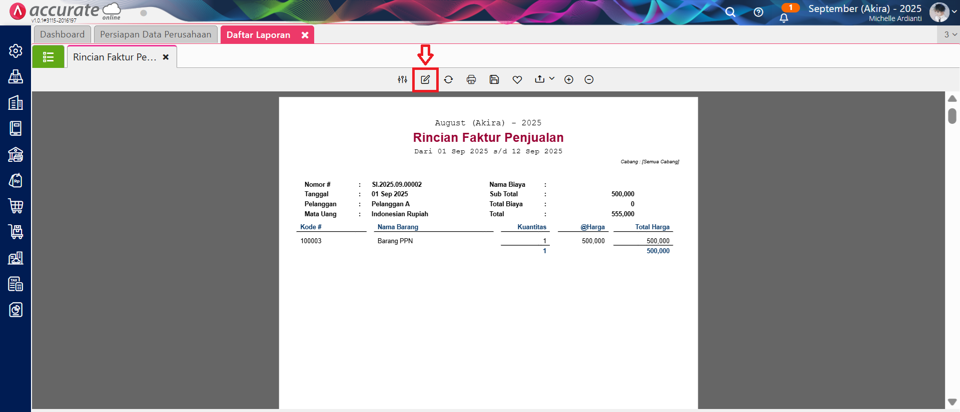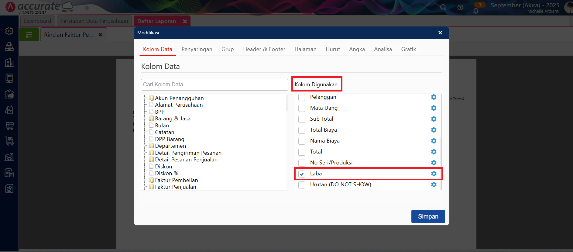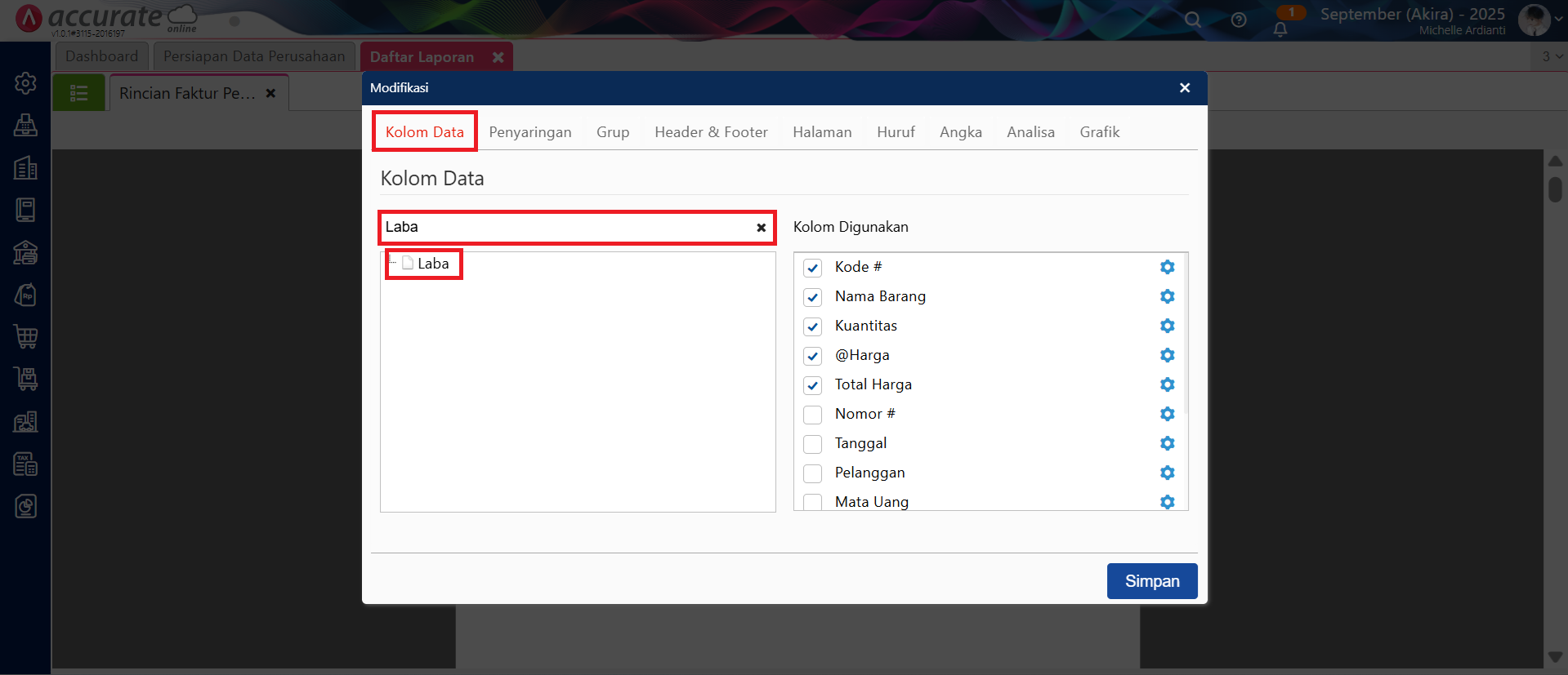 Laba per Faktur bisa ditampilkan pada laporan Rincian Faktur Penjualan dan berikut ini langkah-langkah untuk menampilkan nilai laba per faktur: