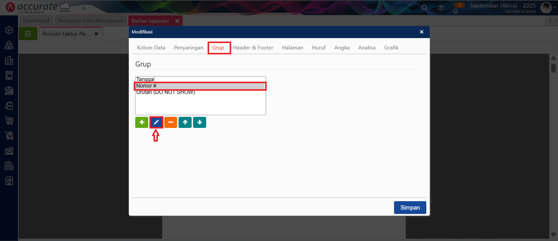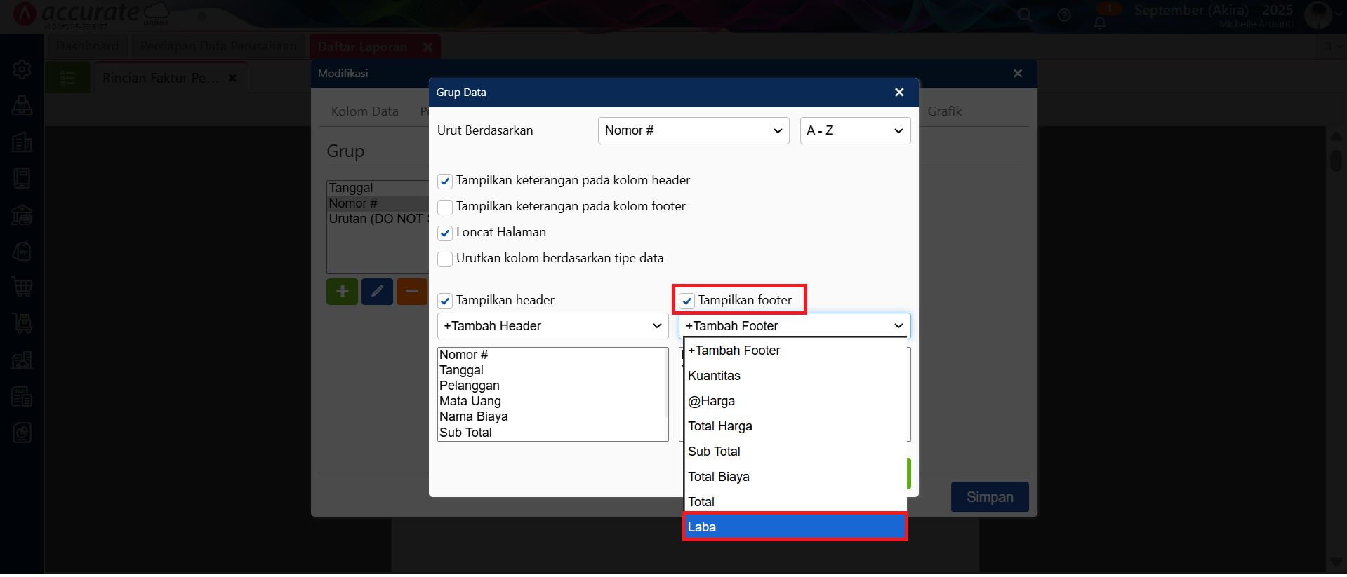 - Pada tampilan Grup Data untuk variable Nomor #, tambahkan variable ‘Laba‘ pada bagian Footer, kemudian klik Simpan.